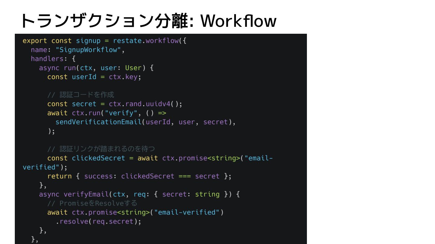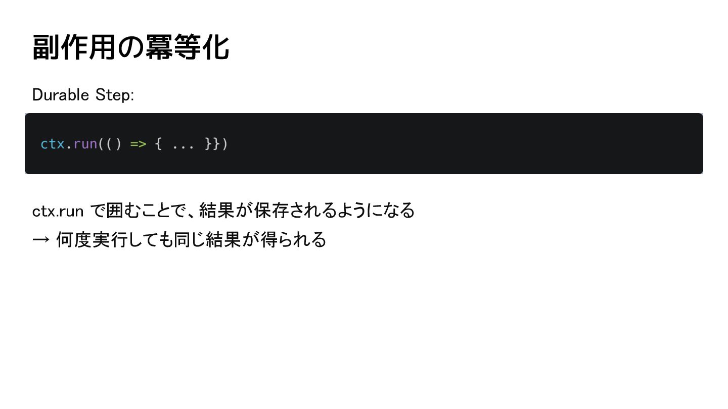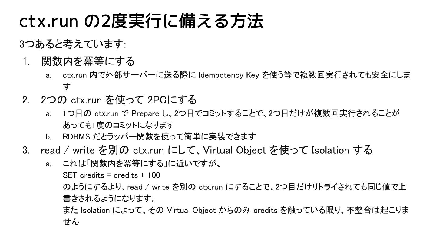a. 1つ目の ctx.run で Prepare し、2つ目でコミットすることで、2つ目だけが複数回実行されることが あっても1度のコミットになります
