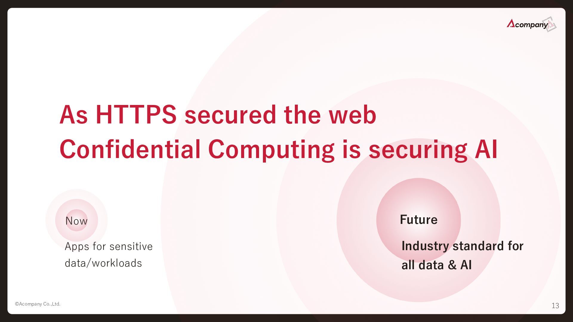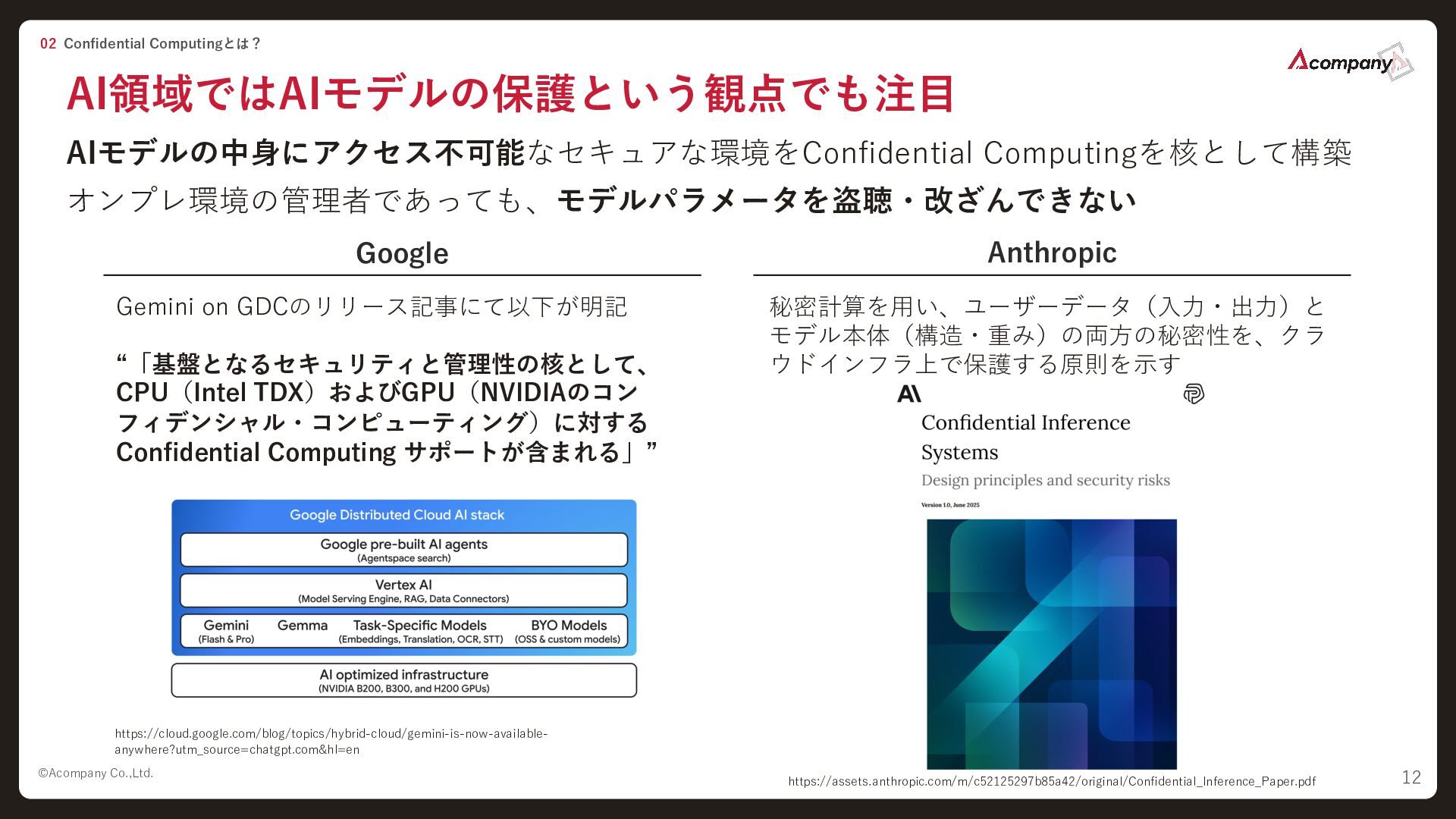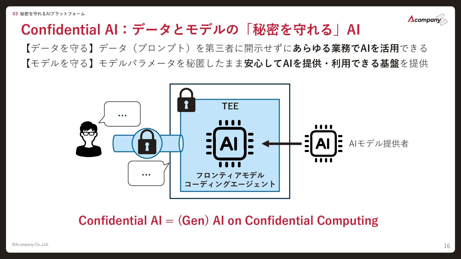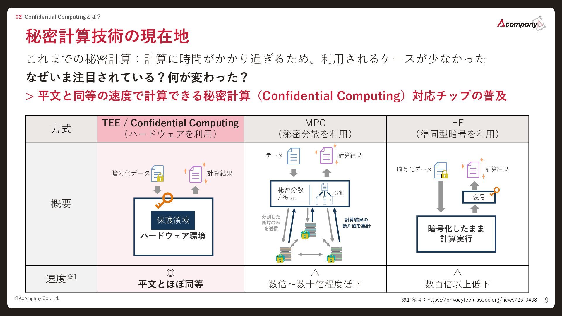 サービス提供者であるApple/Metaでさえユーザーのデータを⾒ることができない環境を実現 Apple Intelligence iPhone上のデータに対する⽣成AI処理を、Apple社 のサーバで実現。メモリ暗号化されているため、個 ⼈のプロンプトを閲覧できないため安全 Meta Private Processing WhatsApp上で⼊⼒されているテキスト情報をMeta のサーバーで処理する際にHW型秘密計算を利⽤。 Metaでさえデータを閲覧できないため安全 出典:Apple Intelligence紹介ページ、Engineering at Meta「Building Private Processing for AI tools on WhatsApp」