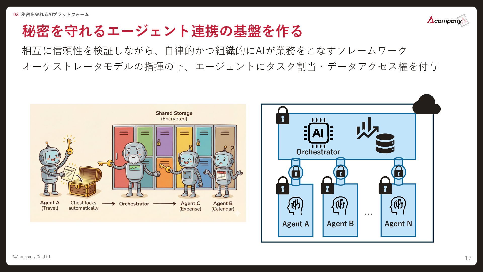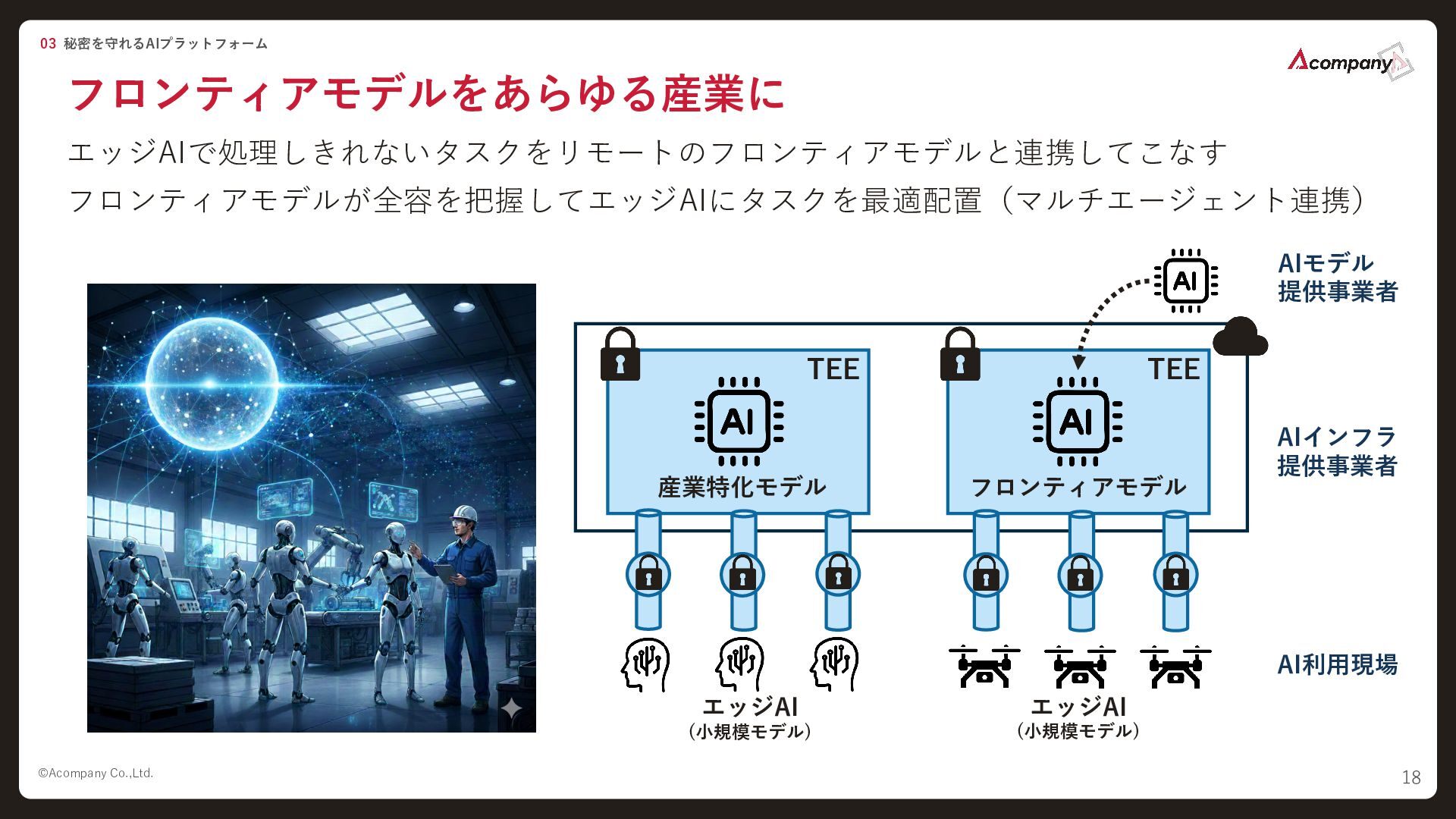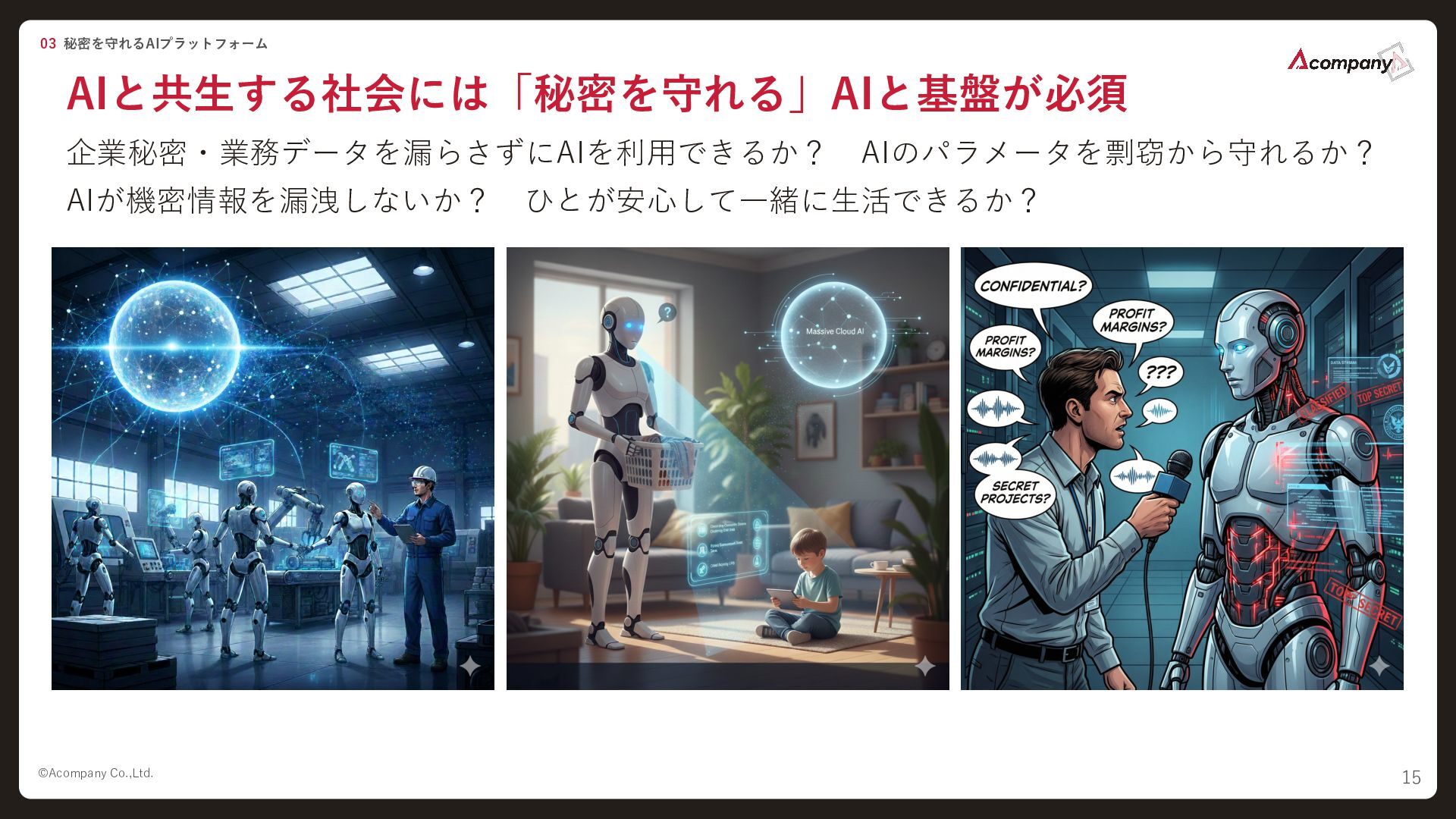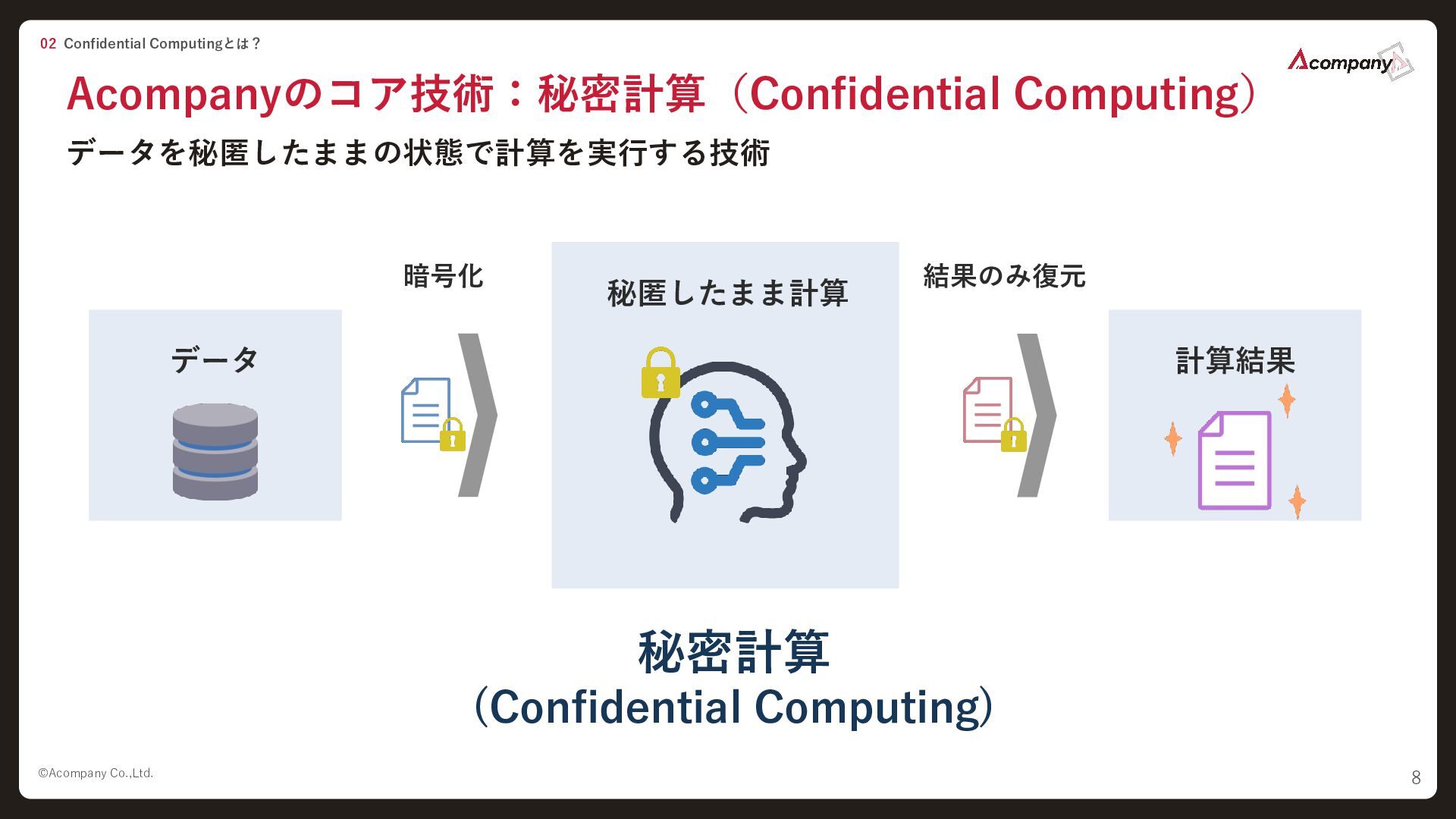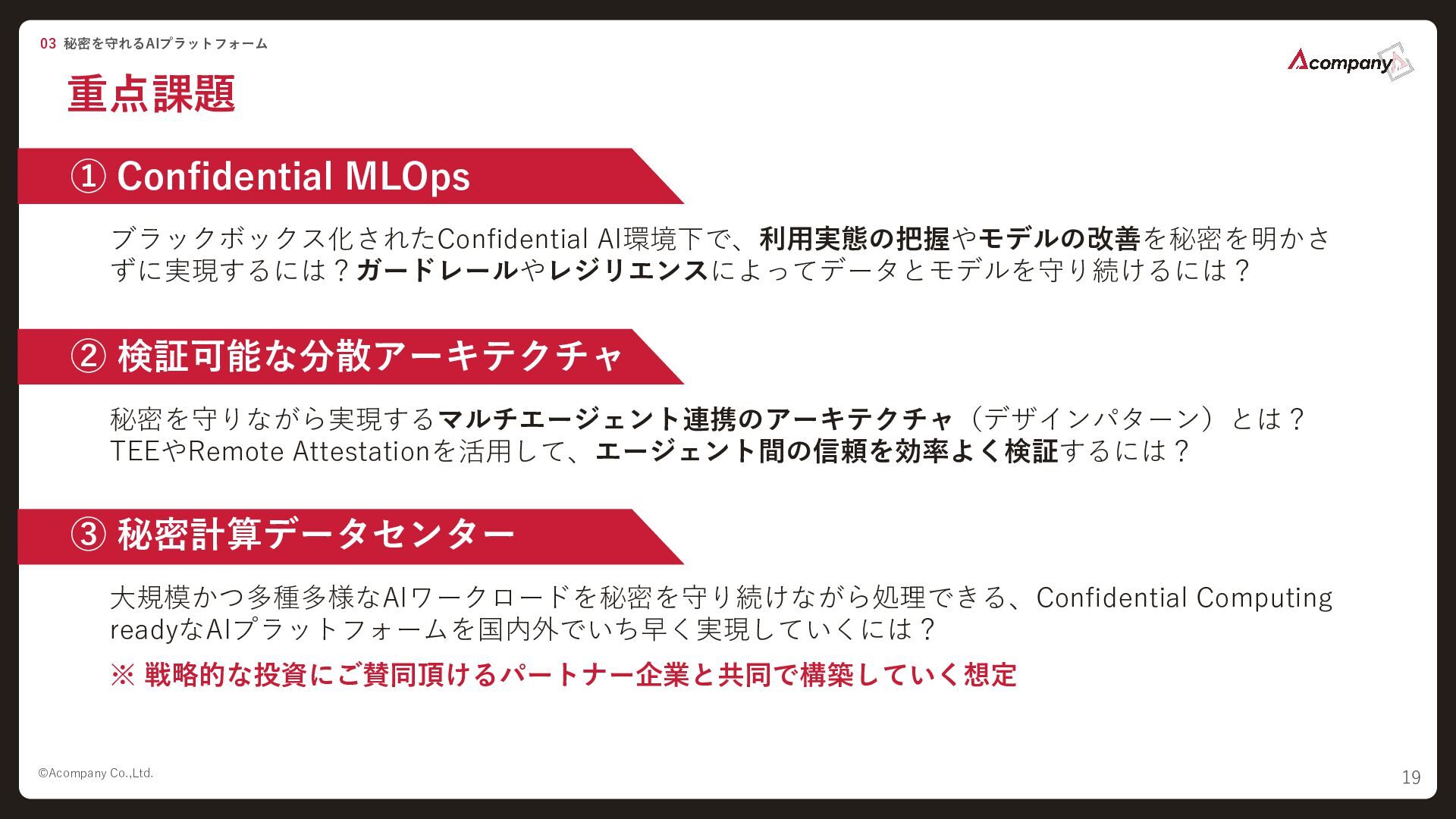 サービス提供者であるApple/Metaでさえユーザーのデータを⾒ることができない環境を実現 Apple Intelligence iPhone上のデータに対する⽣成AI処理を、Apple社 のサーバで実現。メモリ暗号化されているため、個 ⼈のプロンプトを閲覧できないため安全 Meta Private Processing WhatsApp上で⼊⼒されているテキスト情報をMeta のサーバーで処理する際にHW型秘密計算を利⽤。 Metaでさえデータを閲覧できないため安全 出典:Apple Intelligence紹介ページ、Engineering at Meta「Building Private Processing for AI tools on WhatsApp」