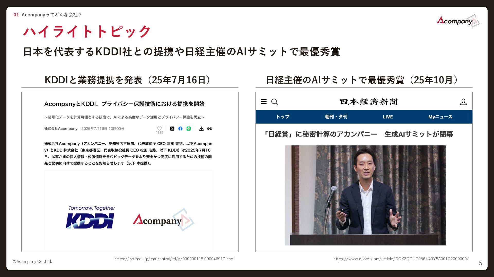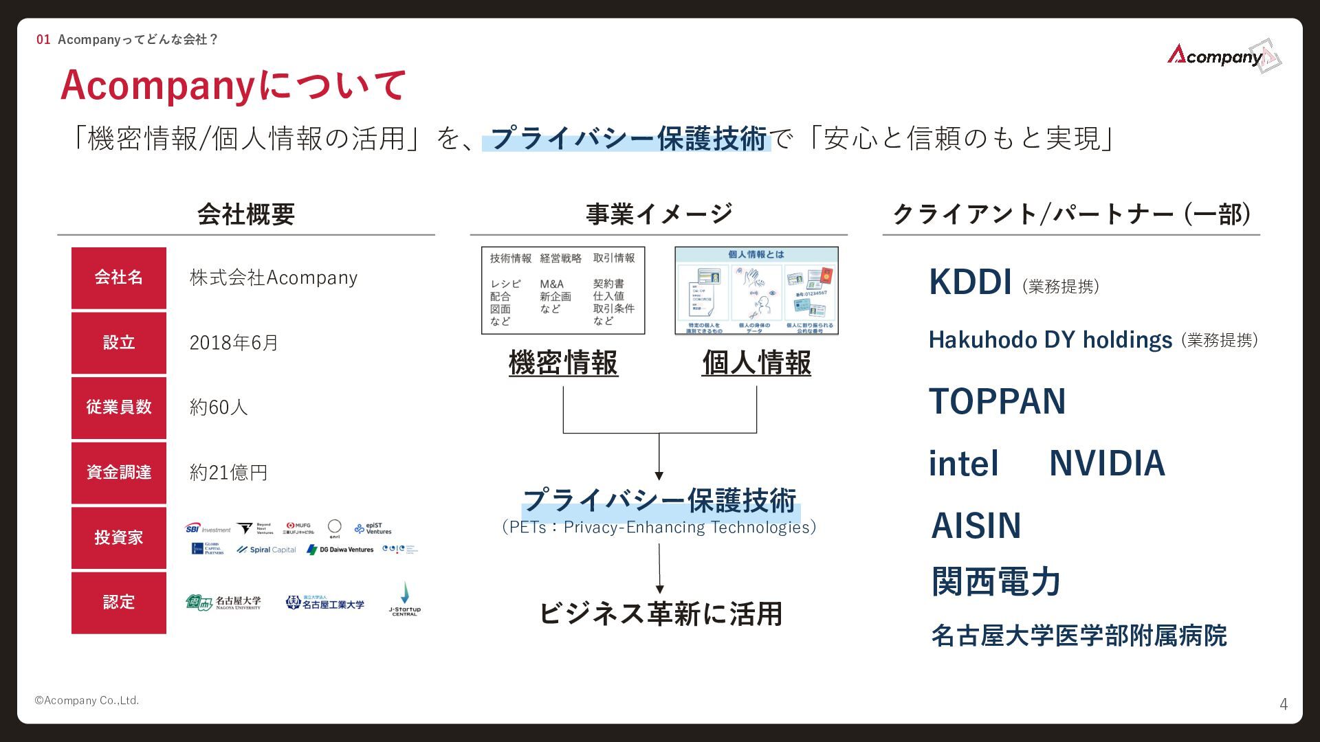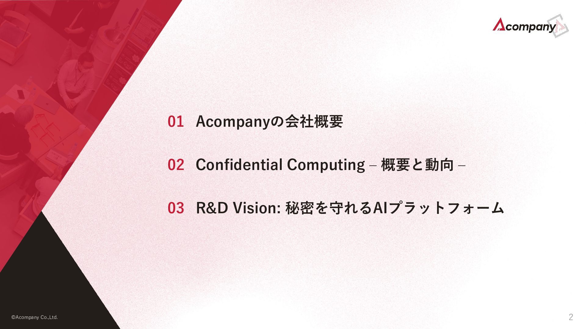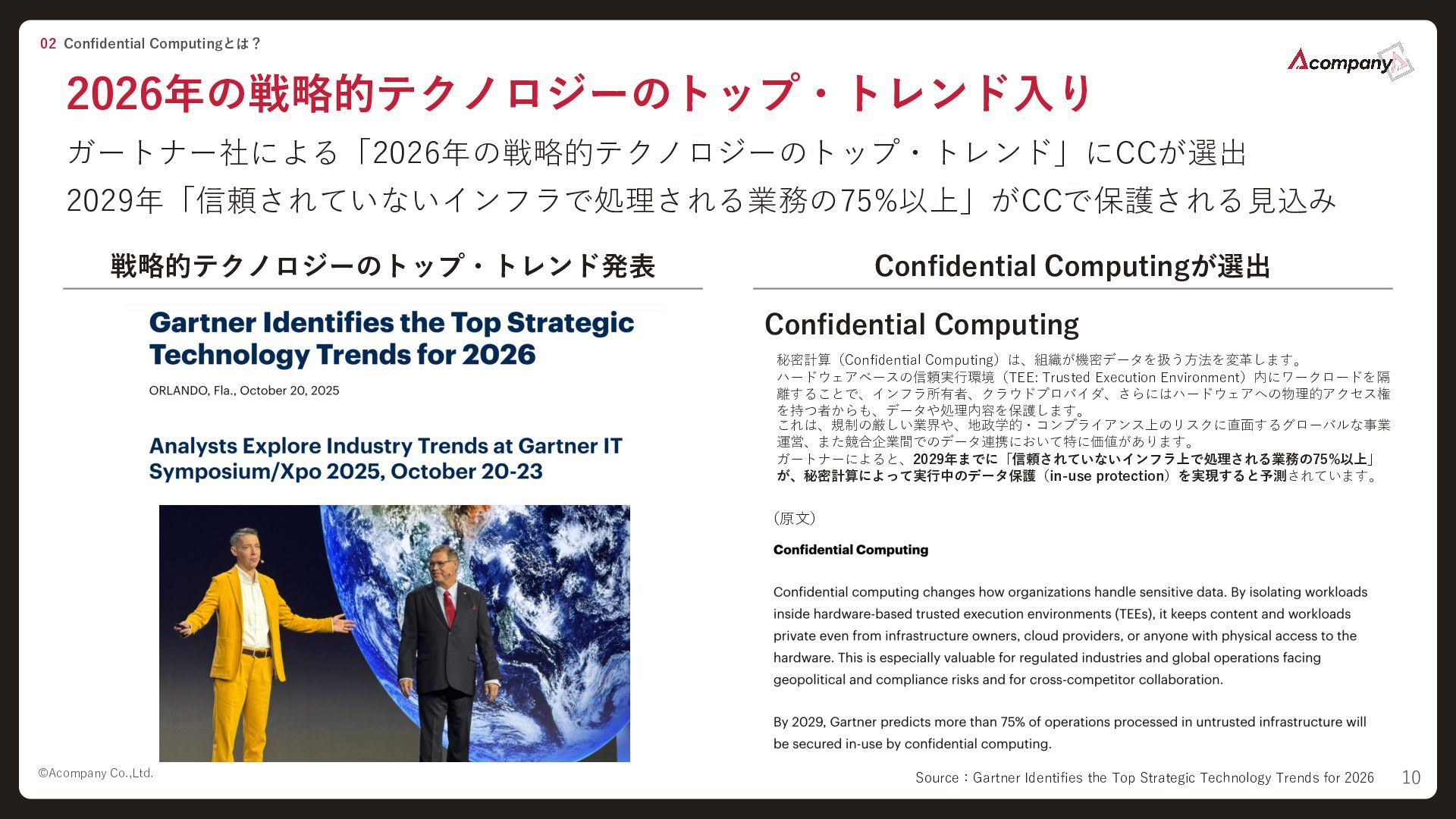 サービス提供者であるApple/Metaでさえユーザーのデータを⾒ることができない環境を実現 Apple Intelligence iPhone上のデータに対する⽣成AI処理を、Apple社 のサーバで実現。メモリ暗号化されているため、個 ⼈のプロンプトを閲覧できないため安全 Meta Private Processing WhatsApp上で⼊⼒されているテキスト情報をMeta のサーバーで処理する際にHW型秘密計算を利⽤。 Metaでさえデータを閲覧できないため安全 出典:Apple Intelligence紹介ページ、Engineering at Meta「Building Private Processing for AI tools on WhatsApp」
