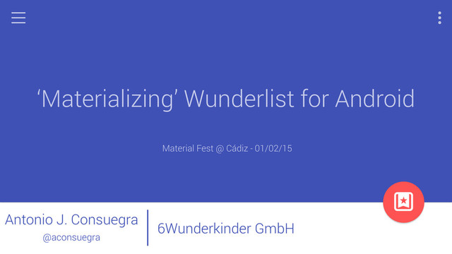 Our approach to Material Design guidelines. Should we follow the guidelines? Or should we adapt them to our needs? In this talk, we will cover how Wunderlist for Android it is being 'materialised'.