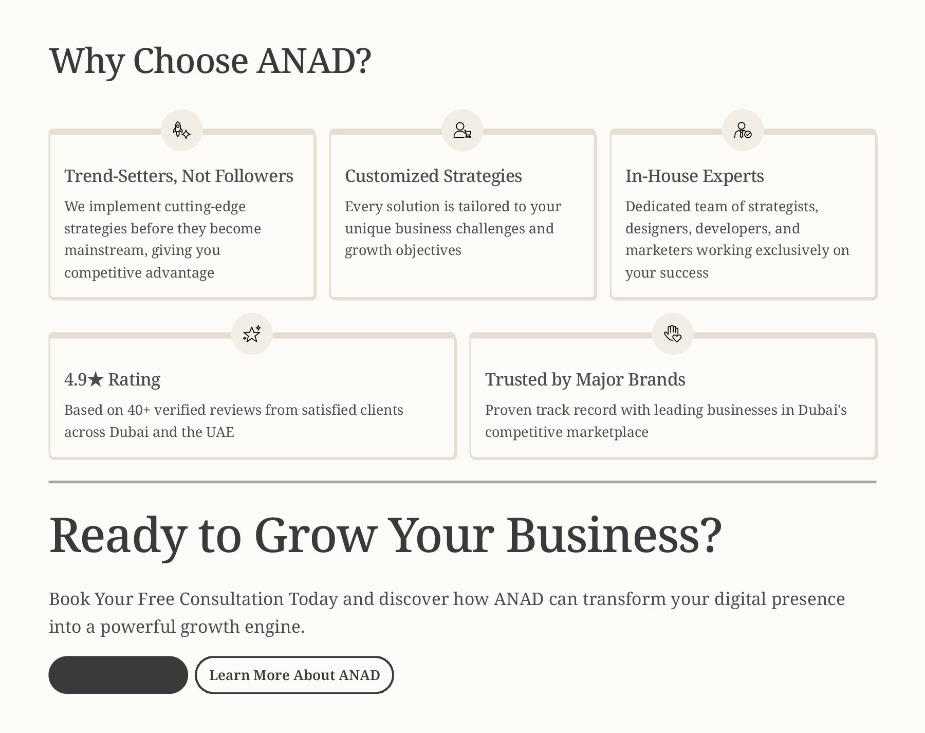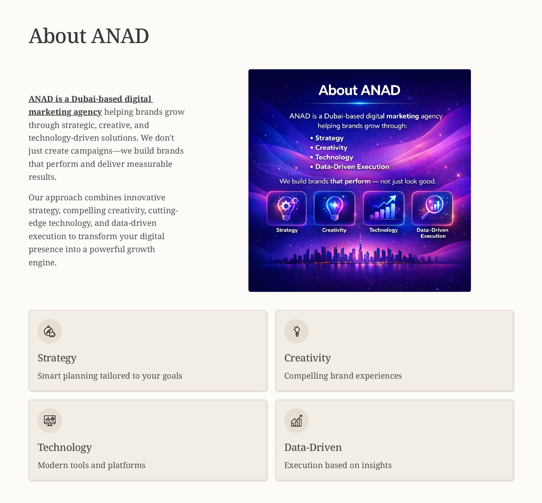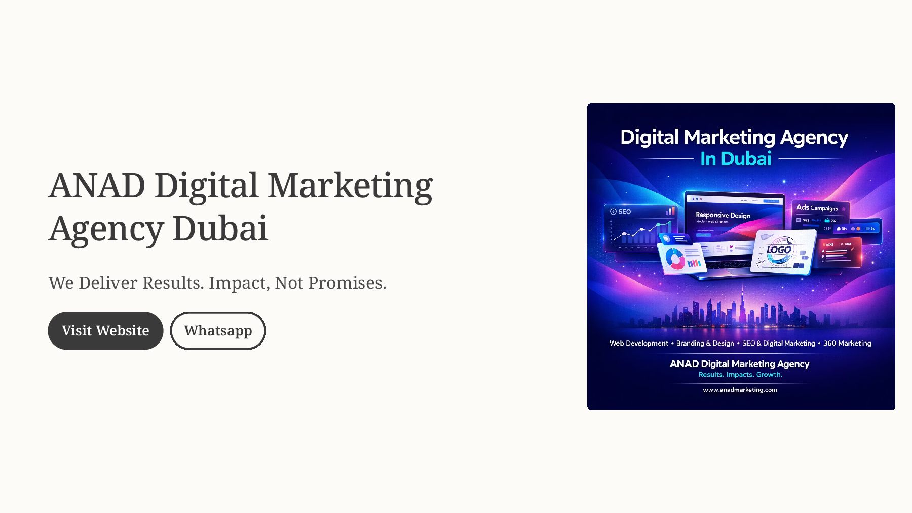 ANAD Digital Marketing Agency Dubai is a full-service agency delivering high-performance web development, branding & design, SEO, social media marketing, paid advertising, and complete 360° marketing solutions.