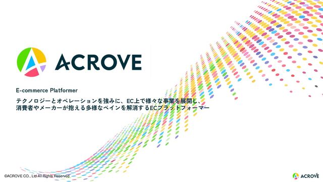 当に欲しい人に届けられていないということです。メーカー様も、集客はInstagramやTiktok、売り場 はAmazonや楽天、自社EC…と変化の激しいグローバルプラットフォームを使いこなし、売上を伸ば していくことはなかなか難しいことが現状です。 ACROVEは、この課題に対し、 ① 自社開発のBIツール「ACROVE FORCE」を通じ蓄積したECビッグデータ及び知見 ② 日常的にEC/SNSを利用する若手を中心とした組織によるマーケティング能力 ③ 集客から売り場作り、配送、サポートまで一気通貫で支援するプロダクト・サービス を通じ、良いモノをあらゆるヒトに届けていけるよう取り組んでいます。 しかし、今後数十兆円となっていくEC市場におけるNo.1となるには、まだまだ圧倒的に仲間が 足りません。ぜひ皆さんとともに、令和を代表するメガベンチャーを創り、社会に価値を提供して いきたいと思います。そして、「商売を通じた人間育成」により、日本や世界を支える人材を どんどん輩出していけるよう、私自身も最大限支援していきます。 代表取締役 CEO 荒井俊亮 トップメッセージ