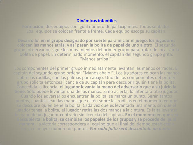 Todos sentados. Los equipos se colocan frente a frente. Cada equipo escoge su capitán. Desarrollo: en el grupo designado por suerte para iniciar el juego, los jugadores colocan las manos atrás, y así pasan la bolita de papel de uno a otro. El segundo grupo, observador, sigue los movimientos del primer grupo para tratar de localizar la bolita de papel. En determinado momento, el capitán del segundo grupo grita: "Manos arriba!". Los componentes del primer grupo inmediatamente levantan las manos cerradas. El capitán del segundo grupo ordena: "Manos abajo!". Los jugadores colocan las manos sobre las rodillas, con las palmas para abajo. Uno de los componentes del primer grupo solicita entonces licencia de su capitán para descubrir quién tiene la bolita. Concedida la licencia, el jugador levanta la mano del adversario que a su juicio la tiene. Sólo puede levantar una de las manos. Si no acierta, lo intentará otro jugador. Cuando los adversarios encuentren la bolita, se marca un punto. Serán tantos puntos, cuantas sean las manos que estén sobre las rodillas en el momento en que se descubre quién tiene la bolita. Cada vez que es levantada una mano, sin que el jugador tenga la bolita, el jugador retira las dos manos a la cintura. Es falta levantar la mano de un jugador contrario sin licencia del capitán. En el momento en que sea descubierta la bolita, se cambian los papeles de los grupos y se procede de igual manera. La victoria corresponderá al equipo que al final del tiempo establecido tenga el mayor número de puntos. Por cada falta será descontado un punto.