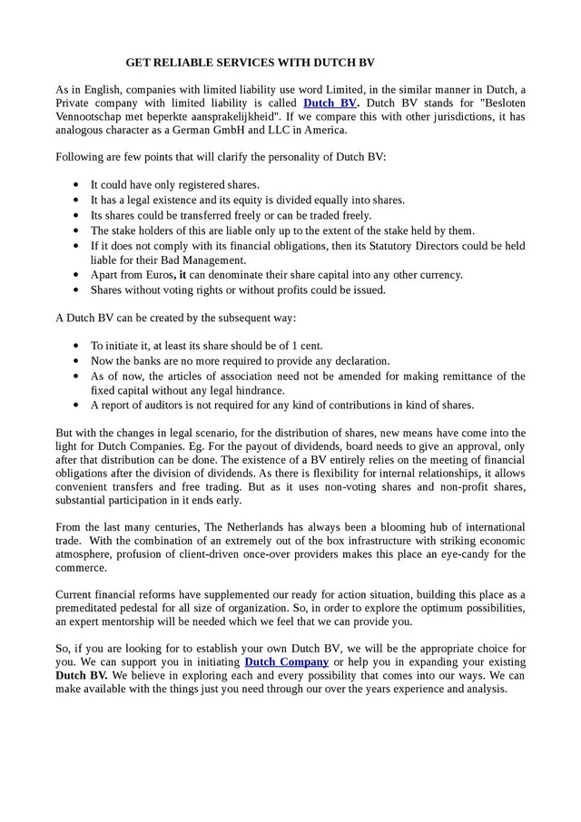 with limited liability use word Limited, in the similar manner in Dutch, a Private company with limited liability is called Dutch BV. Dutch BV stands for "Besloten Vennootschap met beperkte aansprakelijkheid". If we compare this with other jurisdictions, it has analogous character as a German GmbH and LLC in America. Following are few points that will clarify the personality of Dutch BV: • It could have only registered shares. • It has a legal existence and its equity is divided equally into shares. • Its shares could be transferred freely or can be traded freely. • The stake holders of this are liable only up to the extent of the stake held by them. • If it does not comply with its financial obligations, then its Statutory Directors could be held liable for their Bad Management. • Apart from Euros, it can denominate their share capital into any other currency. • Shares without voting rights or without profits could be issued. A Dutch BV can be created by the subsequent way: • To initiate it, at least its share should be of 1 cent. • Now the banks are no more required to provide any declaration. • As of now, the articles of association need not be amended for making remittance of the fixed capital without any legal hindrance. • A report of auditors is not required for any kind of contributions in kind of shares. But with the changes in legal scenario, for the distribution of shares, new means have come into the light for Dutch Companies. Eg. For the payout of dividends, board needs to give an approval, only after that distribution can be done. The existence of a BV entirely relies on the meeting of financial obligations after the division of dividends. As there is flexibility for internal relationships, it allows convenient transfers and free trading. But as it uses non-voting shares and non-profit shares, substantial participation in it ends early. From the last many centuries, The Netherlands has always been a blooming hub of international trade. With the combination of an extremely out of the box infrastructure with striking economic atmosphere, profusion of client-driven once-over providers makes this place an eye-candy for the commerce. Current financial reforms have supplemented our ready for action situation, building this place as a premeditated pedestal for all size of organization. So, in order to explore the optimum possibilities, an expert mentorship will be needed which we feel that we can provide you. So, if you are looking for to establish your own Dutch BV, we will be the appropriate choice for you. We can support you in initiating Dutch Company or help you in expanding your existing Dutch BV. We believe in exploring each and every possibility that comes into our ways. We can make available with the things just you need through our over the years experience and analysis.