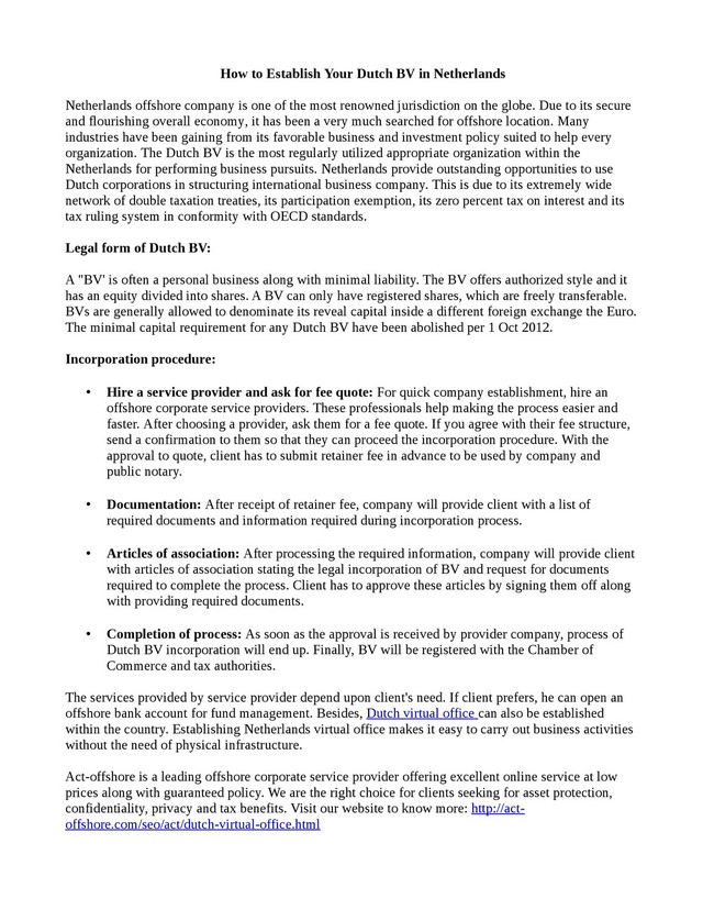 company is one of the most renowned jurisdiction on the globe. Due to its secure and flourishing overall economy, it has been a very much searched for offshore location. Many industries have been gaining from its favorable business and investment policy suited to help every organization. The Dutch BV is the most regularly utilized appropriate organization within the Netherlands for performing business pursuits. Netherlands provide outstanding opportunities to use Dutch corporations in structuring international business company. This is due to its extremely wide network of double taxation treaties, its participation exemption, its zero percent tax on interest and its tax ruling system in conformity with OECD standards. Legal form of Dutch BV: A "BV' is often a personal business along with minimal liability. The BV offers authorized style and it has an equity divided into shares. A BV can only have registered shares, which are freely transferable. BVs are generally allowed to denominate its reveal capital inside a different foreign exchange the Euro. The minimal capital requirement for any Dutch BV have been abolished per 1 Oct 2012. Incorporation procedure: Hire a service provider and ask for fee quote: For quick company establishment, hire an offshore corporate service providers. These professionals help making the process easier and faster. After choosing a provider, ask them for a fee quote. If you agree with their fee structure, send a confirmation to them so that they can proceed the incorporation procedure. With the approval to quote, client has to submit retainer fee in advance to be used by company and public notary. Documentation: After receipt of retainer fee, company will provide client with a list of required documents and information required during incorporation process. Articles of association: After processing the required information, company will provide client with articles of association stating the legal incorporation of BV and request for documents required to complete the process. Client has to approve these articles by signing them off along with providing required documents. Completion of process: As soon as the approval is received by provider company, process of Dutch BV incorporation will end up. Finally, BV will be registered with the Chamber of Commerce and tax authorities. The services provided by service provider depend upon client's need. If client prefers, he can open an offshore bank account for fund management. Besides, Dutch virtual office can also be established within the country. Establishing Netherlands virtual office makes it easy to carry out business activities without the need of physical infrastructure. Act-offshore is a leading offshore corporate service provider offering excellent online service at low prices along with guaranteed policy. We are the right choice for clients seeking for asset protection, confidentiality, privacy and tax benefits. Visit our website to know more: http://act- offshore.com/seo/act/dutch-virtual-office.html