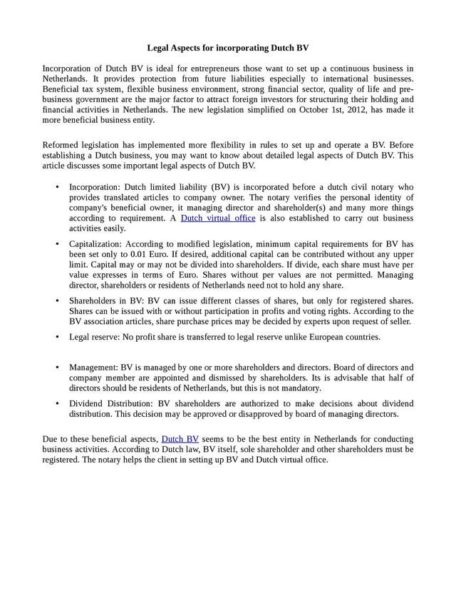 is ideal for entrepreneurs those want to set up a continuous business in Netherlands. It provides protection from future liabilities especially to international businesses. Beneficial tax system, flexible business environment, strong financial sector, quality of life and pre- business government are the major factor to attract foreign investors for structuring their holding and financial activities in Netherlands. The new legislation simplified on October 1st, 2012, has made it more beneficial business entity. Reformed legislation has implemented more flexibility in rules to set up and operate a BV. Before establishing a Dutch business, you may want to know about detailed legal aspects of Dutch BV. This article discusses some important legal aspects of Dutch BV. Incorporation: Dutch limited liability (BV) is incorporated before a dutch civil notary who provides translated articles to company owner. The notary verifies the personal identity of company's beneficial owner, it managing director and shareholder(s) and many more things according to requirement. A Dutch virtual office is also established to carry out business activities easily. Capitalization: According to modified legislation, minimum capital requirements for BV has been set only to 0.01 Euro. If desired, additional capital can be contributed without any upper limit. Capital may or may not be divided into shareholders. If divide, each share must have per value expresses in terms of Euro. Shares without per values are not permitted. Managing director, shareholders or residents of Netherlands need not to hold any share. Shareholders in BV: BV can issue different classes of shares, but only for registered shares. Shares can be issued with or without participation in profits and voting rights. According to the BV association articles, share purchase prices may be decided by experts upon request of seller. Legal reserve: No profit share is transferred to legal reserve unlike European countries. Management: BV is managed by one or more shareholders and directors. Board of directors and company member are appointed and dismissed by shareholders. Its is advisable that half of directors should be residents of Netherlands, but this is not mandatory. Dividend Distribution: BV shareholders are authorized to make decisions about dividend distribution. This decision may be approved or disapproved by board of managing directors. Due to these beneficial aspects, Dutch BV seems to be the best entity in Netherlands for conducting business activities. According to Dutch law, BV itself, sole shareholder and other shareholders must be registered. The notary helps the client in setting up BV and Dutch virtual office.