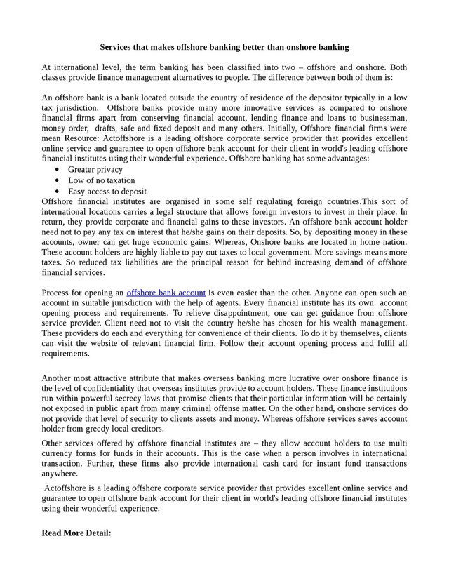 international level, the term banking has been classified into two – offshore and onshore. Both classes provide finance management alternatives to people. The difference between both of them is: An offshore bank is a bank located outside the country of residence of the depositor typically in a low tax jurisdiction. Offshore banks provide many more innovative services as compared to onshore financial firms apart from conserving financial account, lending finance and loans to businessman, money order, drafts, safe and fixed deposit and many others. Initially, Offshore financial firms were mean Resource: Actoffshore is a leading offshore corporate service provider that provides excellent online service and guarantee to open offshore bank account for their client in world's leading offshore financial institutes using their wonderful experience. Offshore banking has some advantages: • Greater privacy • Low of no taxation • Easy access to deposit Offshore financial institutes are organised in some self regulating foreign countries.This sort of international locations carries a legal structure that allows foreign investors to invest in their place. In return, they provide corporate and financial gains to these investors. An offshore bank account holder need not to pay any tax on interest that he/she gains on their deposits. So, by depositing money in these accounts, owner can get huge economic gains. Whereas, Onshore banks are located in home nation. These account holders are highly liable to pay out taxes to local government. More savings means more taxes. So reduced tax liabilities are the principal reason for behind increasing demand of offshore financial services. Process for opening an offshore bank account is even easier than the other. Anyone can open such an account in suitable jurisdiction with the help of agents. Every financial institute has its own account opening process and requirements. To relieve disappointment, one can get guidance from offshore service provider. Client need not to visit the country he/she has chosen for his wealth management. These providers do each and everything for convenience of their clients. To do it by themselves, clients can visit the website of relevant financial firm. Follow their account opening process and fulfil all requirements. Another most attractive attribute that makes overseas banking more lucrative over onshore finance is the level of confidentiality that overseas institutes provide to account holders. These finance institutions run within powerful secrecy laws that promise clients that their particular information will be certainly not exposed in public apart from many criminal offense matter. On the other hand, onshore services do not provide that level of security to clients assets and money. Whereas offshore services saves account holder from greedy local creditors. Other services offered by offshore financial institutes are – they allow account holders to use multi currency forms for funds in their accounts. This is the case when a person involves in international transaction. Further, these firms also provide international cash card for instant fund transactions anywhere. Actoffshore is a leading offshore corporate service provider that provides excellent online service and guarantee to open offshore bank account for their client in world's leading offshore financial institutes using their wonderful experience. Read More Detail: