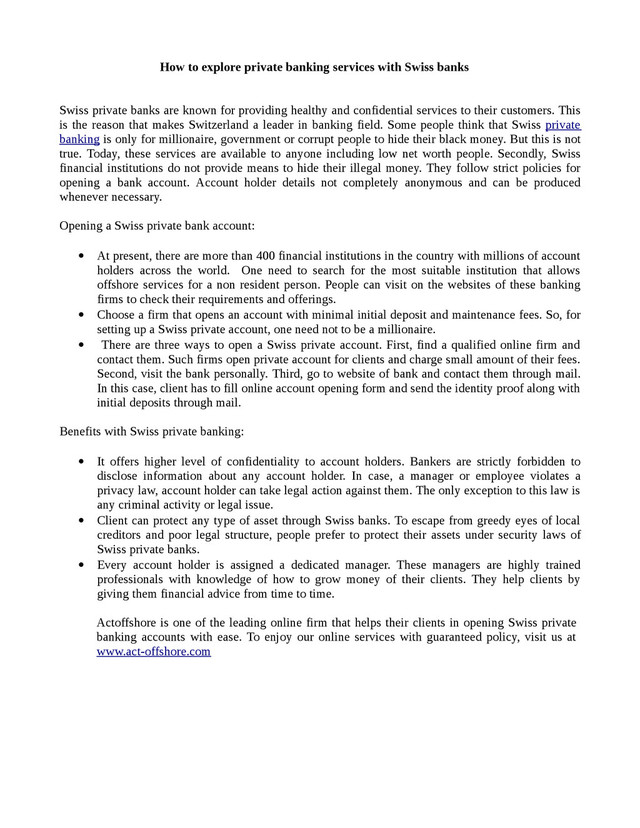 private banks are known for providing healthy and confidential services to their customers. This is the reason that makes Switzerland a leader in banking field. Some people think that Swiss private banking is only for millionaire, government or corrupt people to hide their black money. But this is not true. Today, these services are available to anyone including low net worth people. Secondly, Swiss financial institutions do not provide means to hide their illegal money. They follow strict policies for opening a bank account. Account holder details not completely anonymous and can be produced whenever necessary. Opening a Swiss private bank account: • At present, there are more than 400 financial institutions in the country with millions of account holders across the world. One need to search for the most suitable institution that allows offshore services for a non resident person. People can visit on the websites of these banking firms to check their requirements and offerings. • Choose a firm that opens an account with minimal initial deposit and maintenance fees. So, for setting up a Swiss private account, one need not to be a millionaire. • There are three ways to open a Swiss private account. First, find a qualified online firm and contact them. Such firms open private account for clients and charge small amount of their fees. Second, visit the bank personally. Third, go to website of bank and contact them through mail. In this case, client has to fill online account opening form and send the identity proof along with initial deposits through mail. Benefits with Swiss private banking: • It offers higher level of confidentiality to account holders. Bankers are strictly forbidden to disclose information about any account holder. In case, a manager or employee violates a privacy law, account holder can take legal action against them. The only exception to this law is any criminal activity or legal issue. • Client can protect any type of asset through Swiss banks. To escape from greedy eyes of local creditors and poor legal structure, people prefer to protect their assets under security laws of Swiss private banks. • Every account holder is assigned a dedicated manager. These managers are highly trained professionals with knowledge of how to grow money of their clients. They help clients by giving them financial advice from time to time. Actoffshore is one of the leading online firm that helps their clients in opening Swiss private banking accounts with ease. To enjoy our online services with guaranteed policy, visit us at www.act-offshore.com
