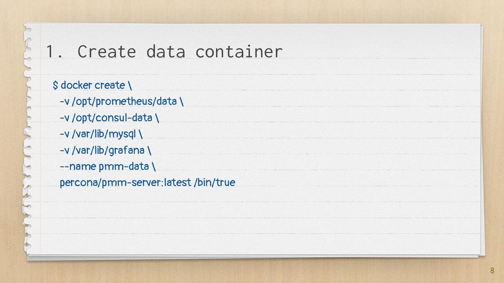 \ -v /opt/consul-data \ -v /var/lib/mysql \ -v /var/lib/grafana \ --name pmm-data \ percona/pmm-server:latest /bin/true 8