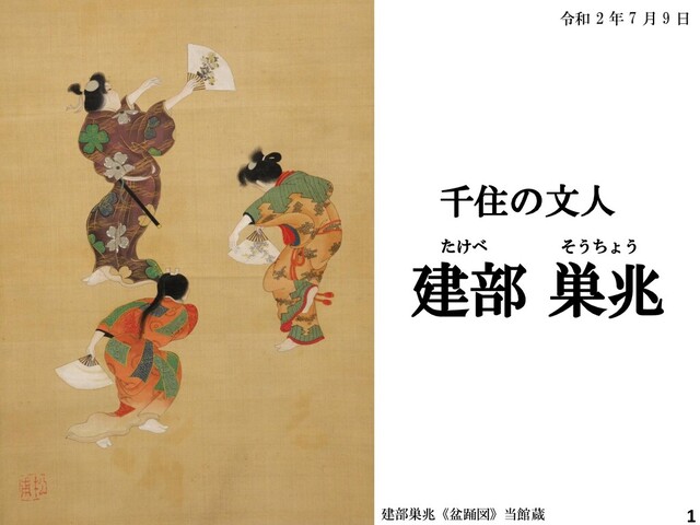 と 来 け り 初 日 影 蓮 根 の 穴 か ら 寒 し 彼 岸 す ぎ い く と せ も 花 に 風 吹 さ く ら か な 我 か ら と 藻 屑 の 中 に 啼 蛙 芋 の 葉 で 一 夜 育 ん 初 な す び 関 の 戸 に ほ の ぼ の 見 ゆ る 糸 瓜 か な 十 六 夜 も は づ れ て 松 の 草 鞋 哉 急 が ね ば 初 雪 の ふ る 旅 路 か な 煤 竹 も た は め ば 雪 の 雀 か な ※ い ず れ も 巣 兆 没 後 刊 行 の 句 集 『 曽 波 可 理 』 ( 文 化 十 四 年 刊 行 ) よ り 。 6 ぎ ょ け い き は つ ひ か げ れ ん こ ん ひ が ん か ぜ ふ く も く ず な く か わ ず い も そ だ て へ ち ま い ざ よ い わ ら じ か な た び じ す す だ け す ず め