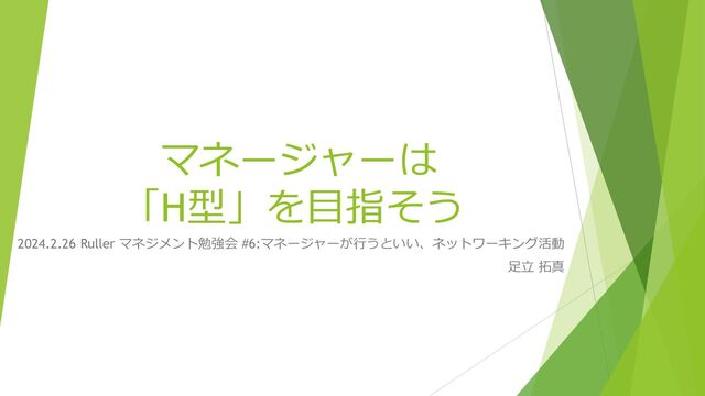 「世界標準の経営理論」第26章に「ストラクチャ ル・ホール理論」について記載。 ストラクチャル・ホール(SH)とは、構造的な隙間の ことで、ネットワークAとBの間に隙間があり、それ がCに便益をもたらす、という考え方。 SHを豊富に持つ人や企業の方が、イノベーションを 起こしやすい、という理論。異なるタイプのネット ワーク結節点になることが重要。 著者である入山氏は、このような越境的人材のこと を「H型人材」と呼んでいる。 A B C ストラクチャル・ホール H型人材 マネージャーは「H型」を目指そう!