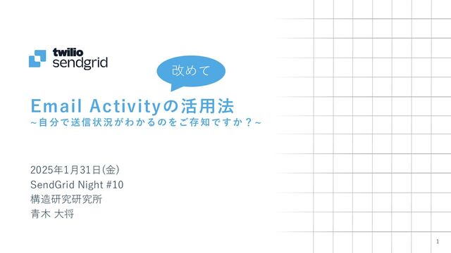 Email Activityの活用法 ~自分で送信状況がわかるのをご存知ですか? ~ 2025年1月31日(金) SendGrid Night #10 構造研究研究所 青木
