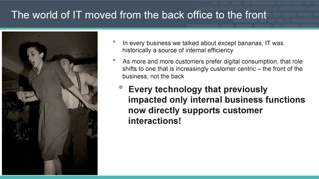 the front • In every business we talked about except bananas, IT was historically a source of internal efficiency • As more and more customers prefer digital consumption, that role shifts to one that is increasingly customer centric – the front of the business, not the back • Every technology that previously impacted only internal business functions now directly supports customer interactions!