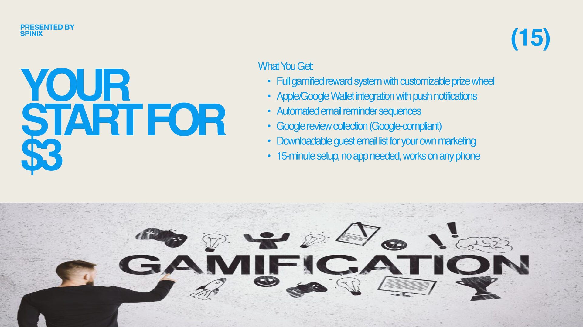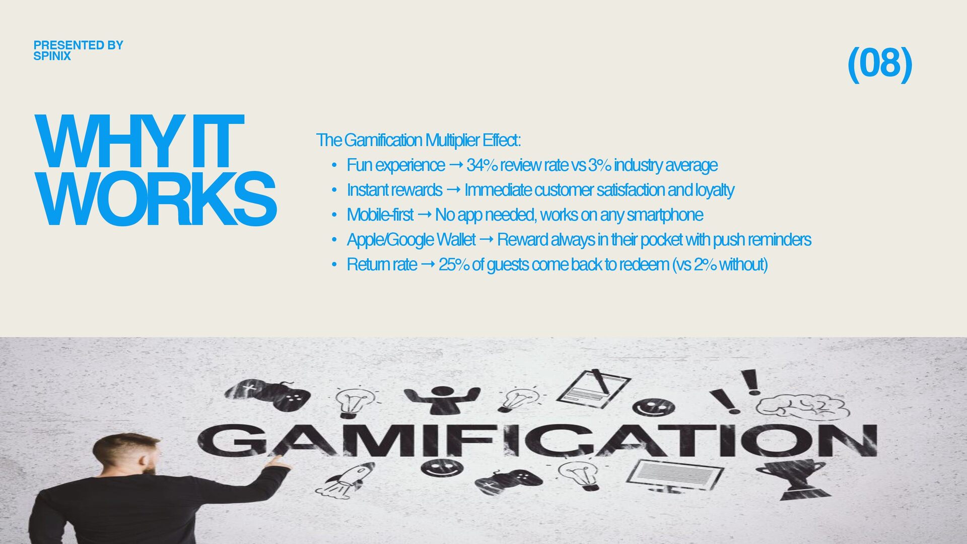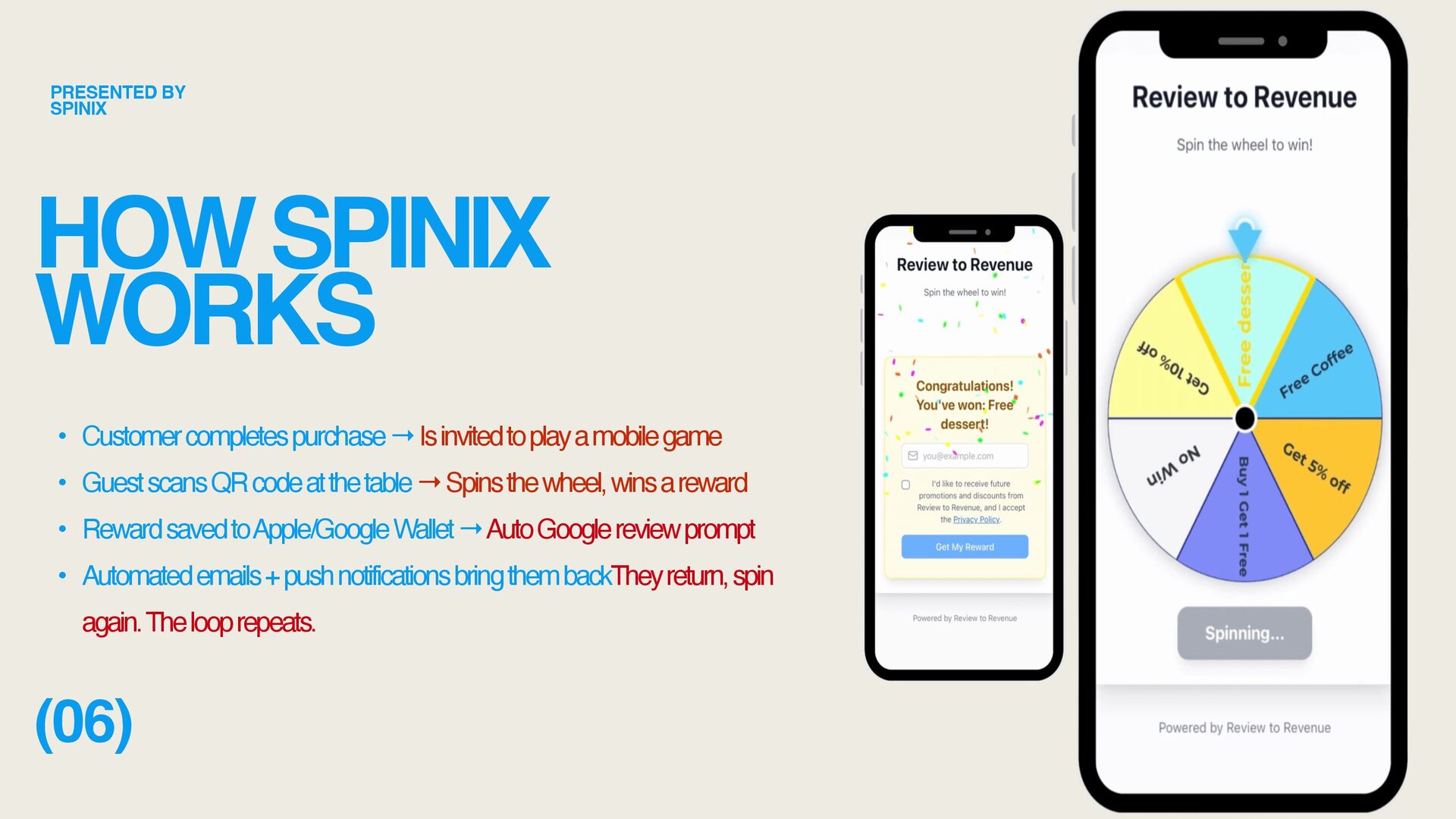 SpiniX helps restaurants and hospitality businesses turn first-time guests into regulars using gamified rewards, automated Google review collection, and Apple Wallet integration. Guests scan a QR code, spin a prize wheel, win a reward saved to their phone, and get automated reminders to return. Results from 70+ active businesses across 8+ countries: 55% email capture rate (7x industry average), 34% Google review rate (10x normal), and 25% of guests return to redeem. Pricing starts at $3 for the first month. No app needed, 15-minute setup, works on any smartphone. Built bootstrapped and profitable without external funding.