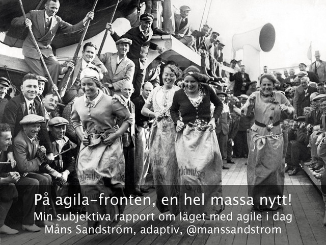 Jag brukade vara frustrerad över att det var så svårt att få team eller organisationer att “förstå och göra rätt”. Nu har jag träffat många företag som, på ett eller annat sätt, strävat efter att styra arbetet med agila värderingar och principer. Dessa värderingar träffar många olika funktioner och kompetenser, varav de flesta helt utelämnades under den första agila revolutionen. Jag vill dela med mig av mina betraktelser av vad som händer i dessa möten. Det här är inte ett kvantitativt “state of agile”, det här är levande historier som bildar min subjektiva syn på vad som händer inom agil utveckling i dag.