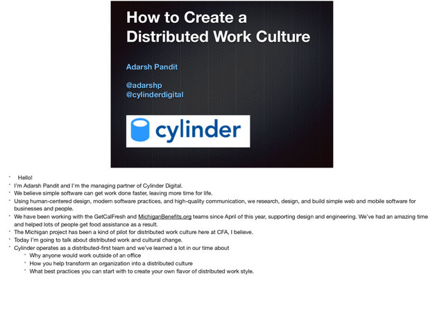 @cylinderdigital * Hello! * I’m Adarsh Pandit and I’m the managing partner of Cylinder Digital. * We believe simple software can get work done faster, leaving more time for life. * Using human-centered design, modern software practices, and high-quality communication, we research, design, and build simple web and mobile software for businesses and people. * We have been working with the GetCalFresh and MichiganBenefits.org teams since April of this year, supporting design and engineering. We’ve had an amazing time and helped lots of people get food assistance as a result. * The Michigan project has been a kind of pilot for distributed work culture here at CFA, I believe. * Today I’m going to talk about distributed work and cultural change. * Cylinder operates as a distributed-first team and we’ve learned a lot in our time about * Why anyone would work outside of an office * How you help transform an organization into a distributed culture * What best practices you can start with to create your own flavor of distributed work style.