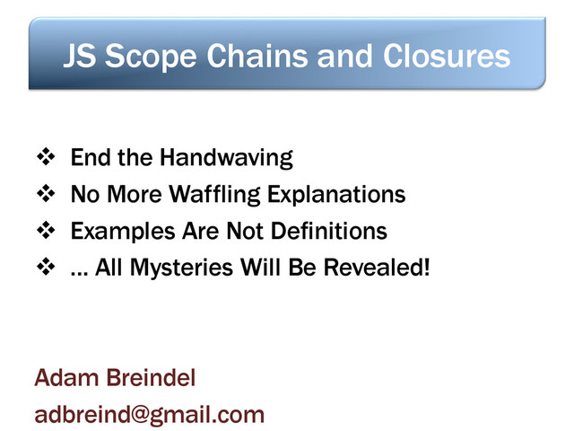 link between a func:on and its scope chain What does it mean? Why is this powerful? • Any:me you execute a func:on, it runs with a scope chain based on where it was defined (not where it is run) PreBy slick… how? • The func)on's hidden [[scope]] reference – holds the scope chain (preven1ng garbage collec1on) – is copied as the new scope's "outer environment reference" any1me the func1on is run, recrea1ng the original chain closures – what? and how?
