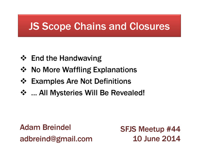 has a global scope – identical with the global object – window in browsers, global in node, self in a worker… • Local variables are declared with "var" and are scoped to the function they are declared within • Function declarations (but not expressions) produce local bindings, and have priority over var in the same scope • When a variable is accessed (declared or not), JS resolves it by looking in the current scope for a variable with that name – If it fails to find one, it looks through the enclosing scopes in order from innermost to global – As soon as it finds a variable with that name it stops and uses that one • If it doesn't find any variable by the end, it produces a ReferenceError (for reads) or "accidentally" (implicitly) creates a global variable (for writes) • As a consequence, if an outer scope variable is "shadowed" by a closer (inner) variable of the same name, the outer will not be accessible by scope resolution