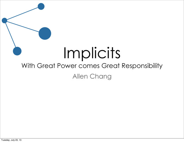 Implicits are a powerful feature of Scala, and this power must be wielded carefully. The talk with cover an introduction to implicits, "pimp my library", view bounds, and context bounds, touching lightly on typeclasses and finally handing off to Vlad to give a more detailed overview of the powerful typeclass pattern. No prior knowledge of implicits is required, but some familiarity with Scala may be needed to understand code samples in the slides.