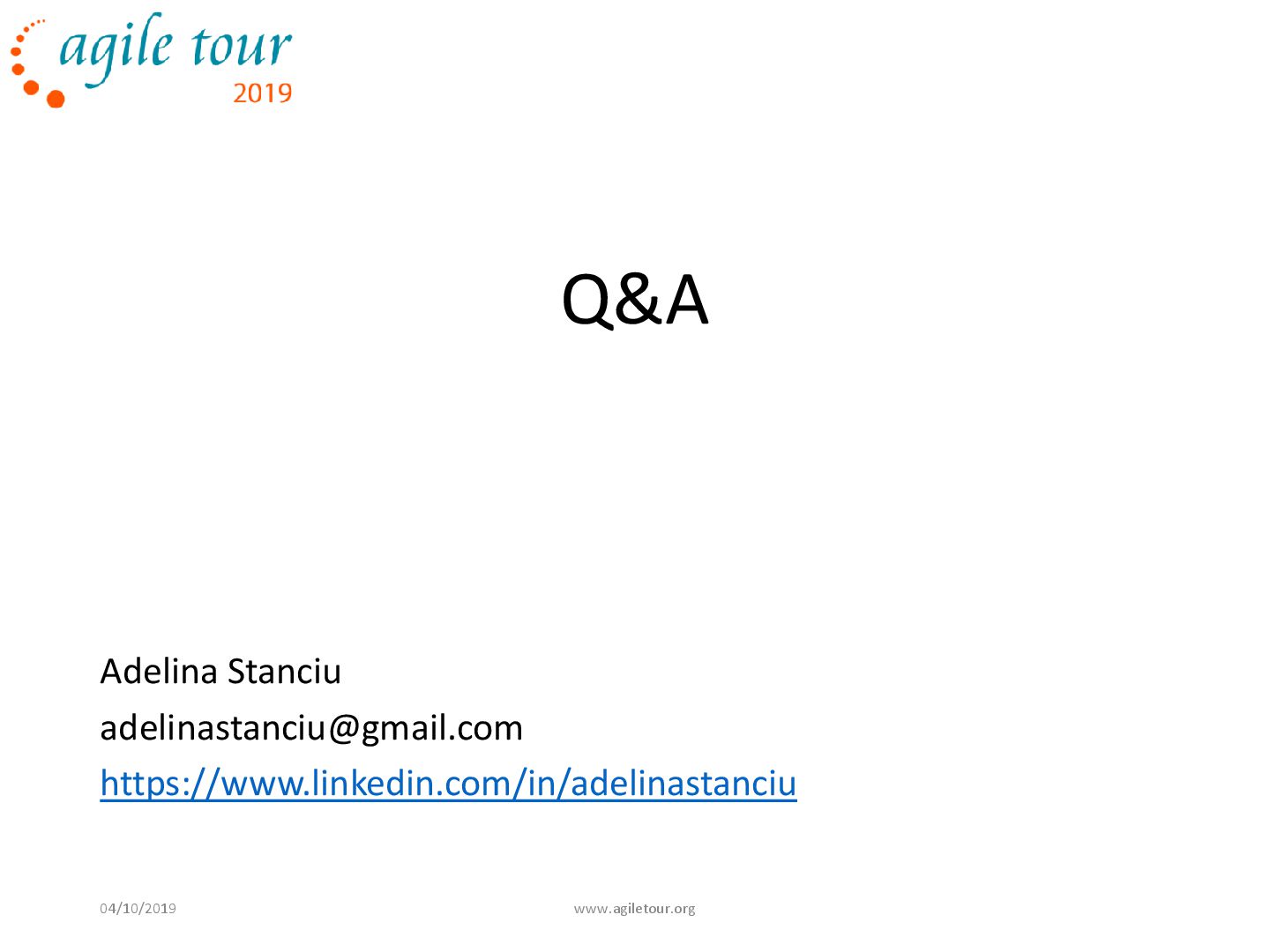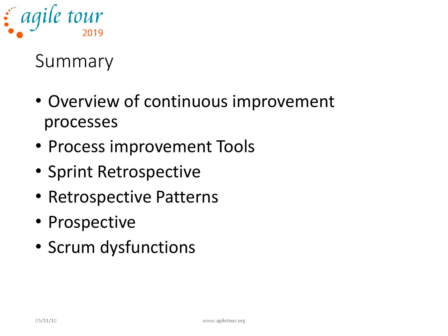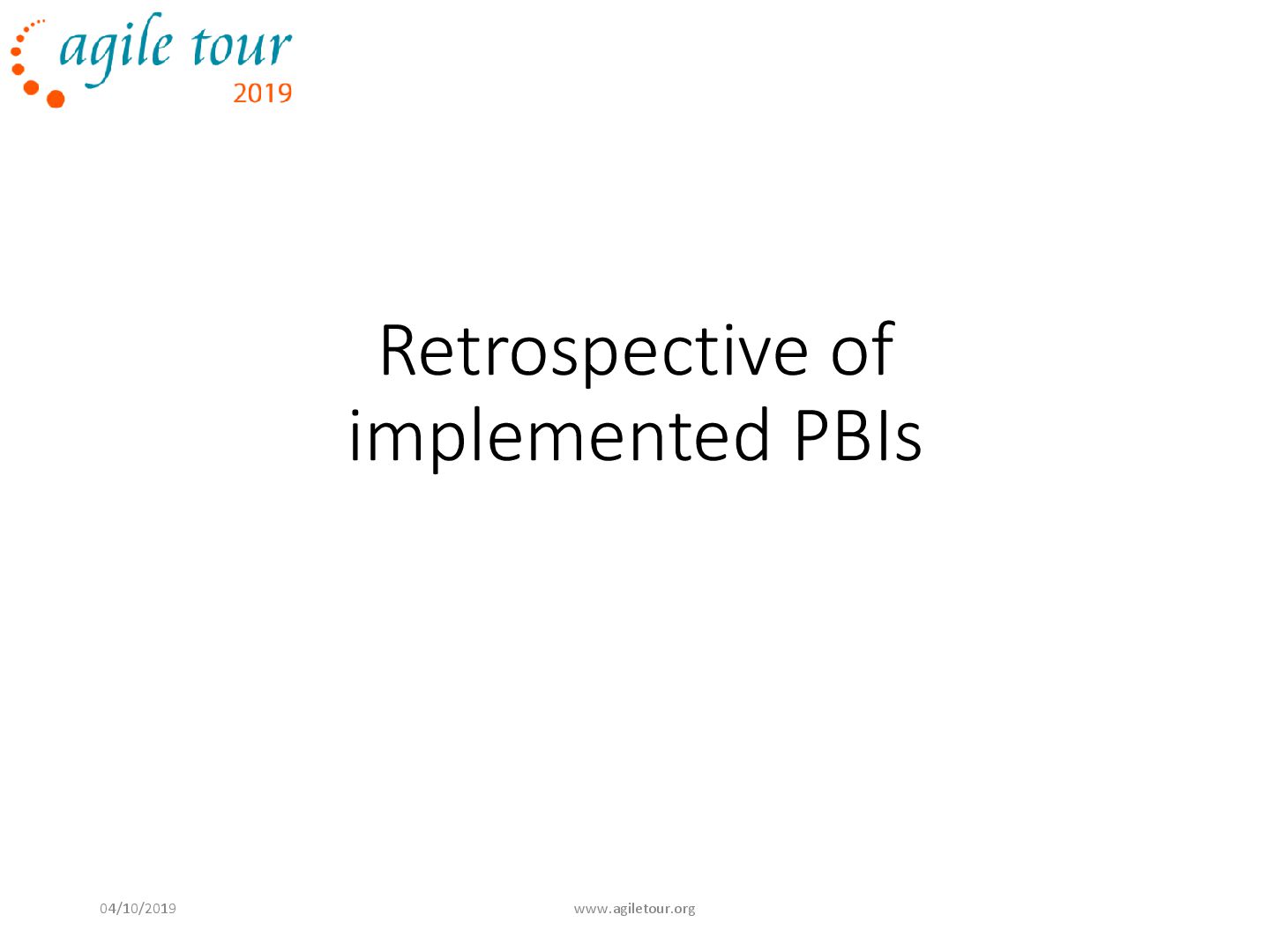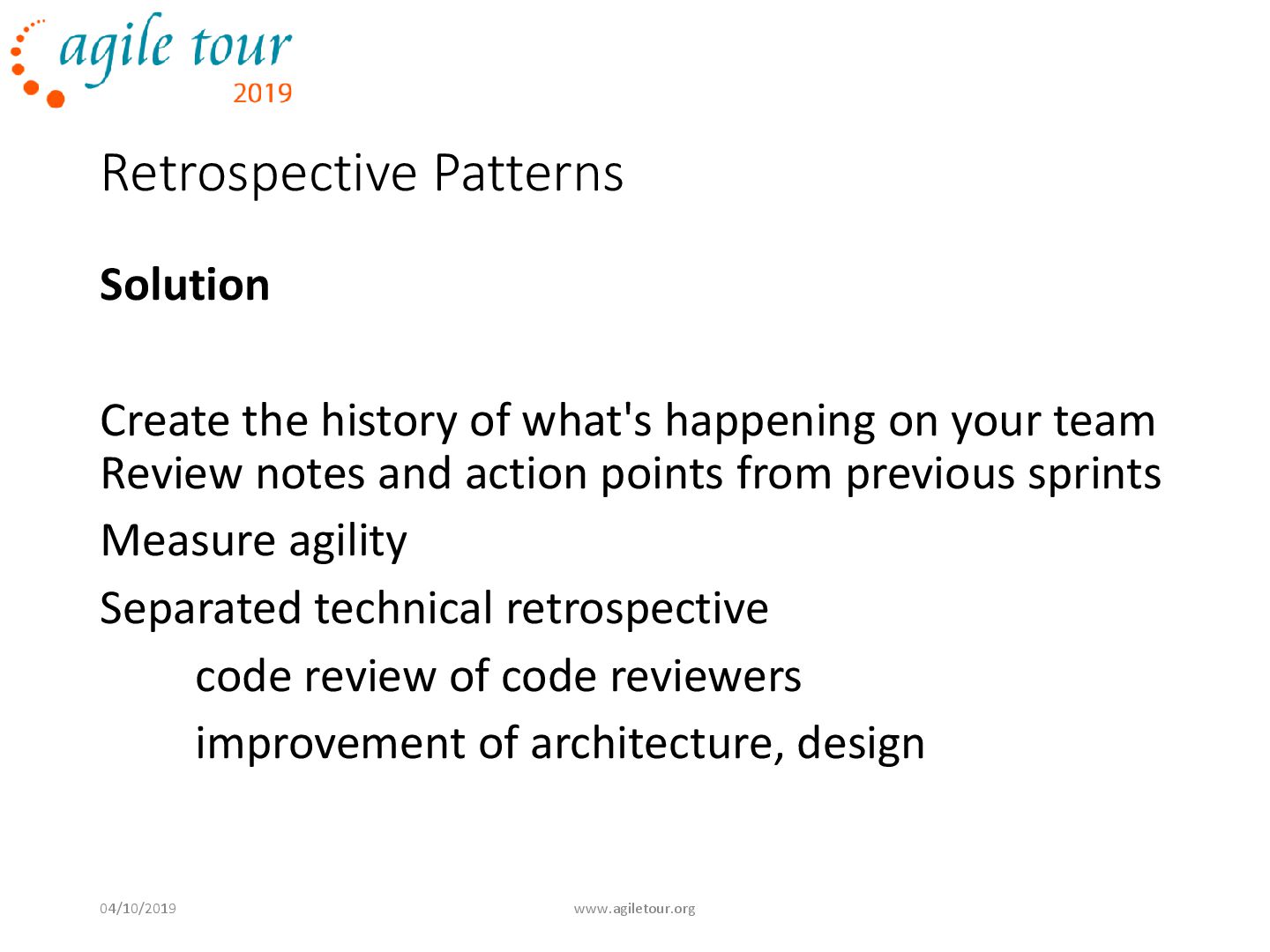 your team Review notes and action points from previous sprints Measure agility Separated technical retrospective code review of code reviewers improvement of architecture, design 04/10/2019 www.agiletour.org