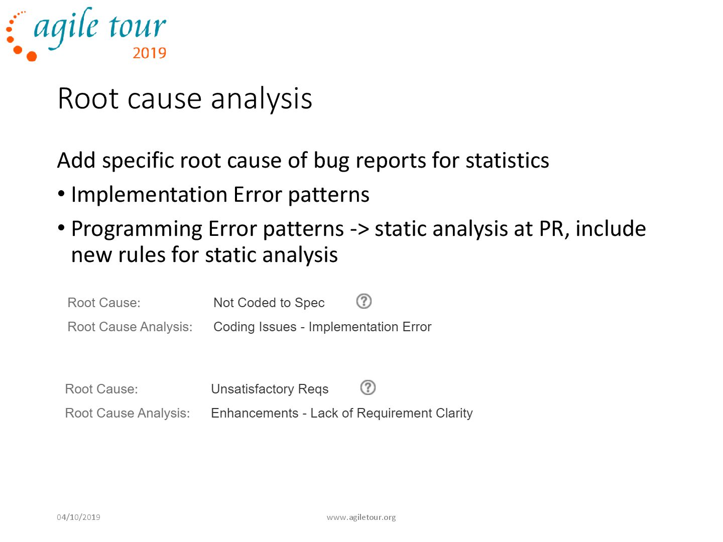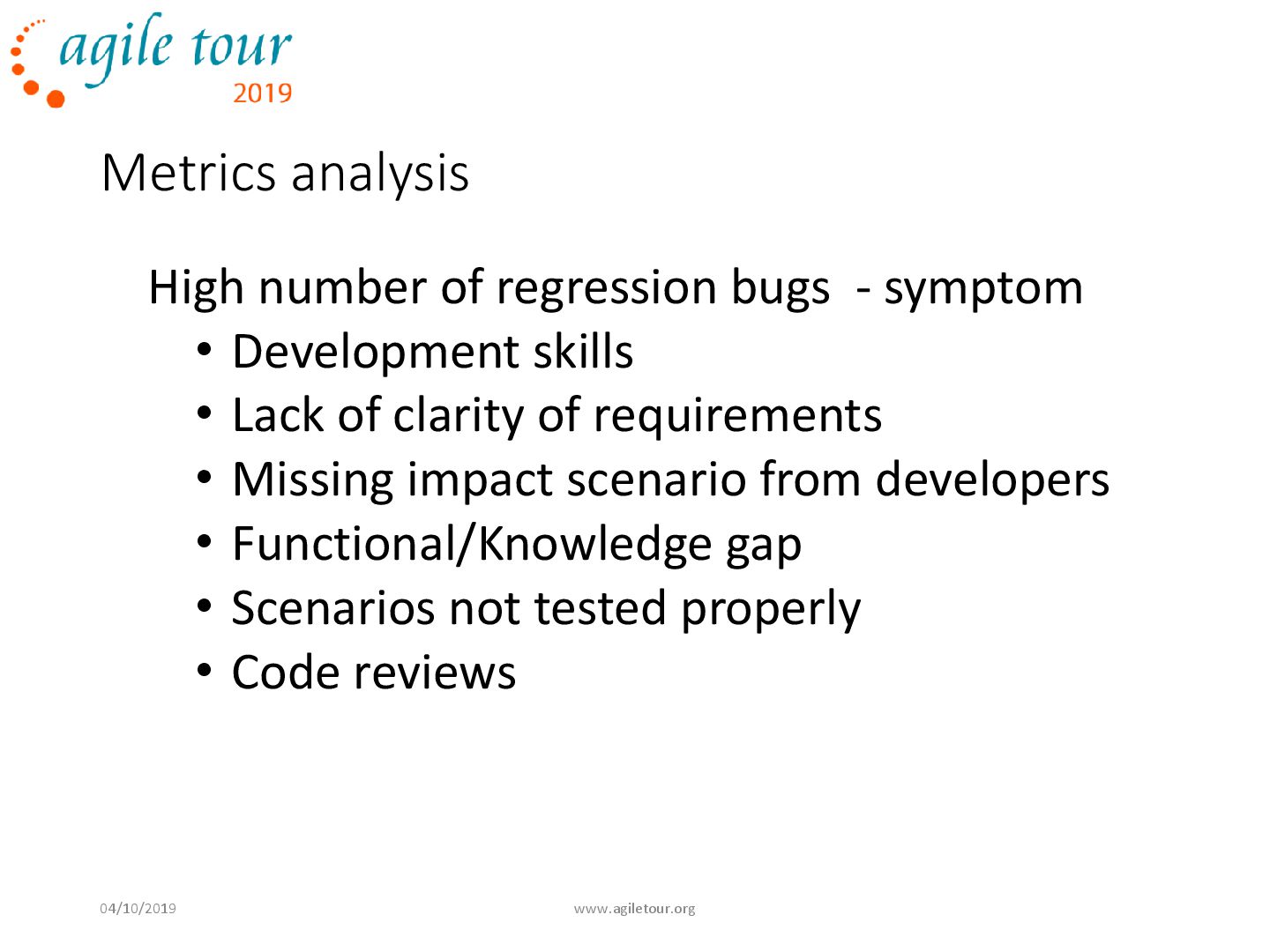 Development skills • Lack of clarity of requirements • Missing impact scenario from developers • Functional/Knowledge gap • Scenarios not tested properly • Code reviews 04/10/2019 www.agiletour.org