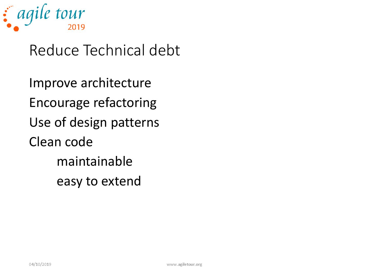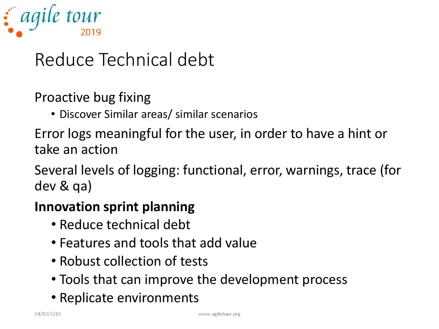 similar scenarios Error logs meaningful for the user, in order to have a hint or take an action Several levels of logging: functional, error, warnings, trace (for dev & qa) Innovation sprint planning • Reduce technical debt • Features and tools that add value • Robust collection of tests • Tools that can improve the development process • Replicate environments 04/10/2019 www.agiletour.org