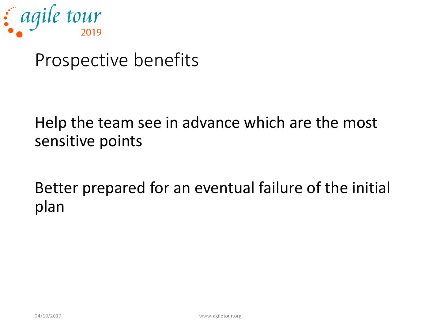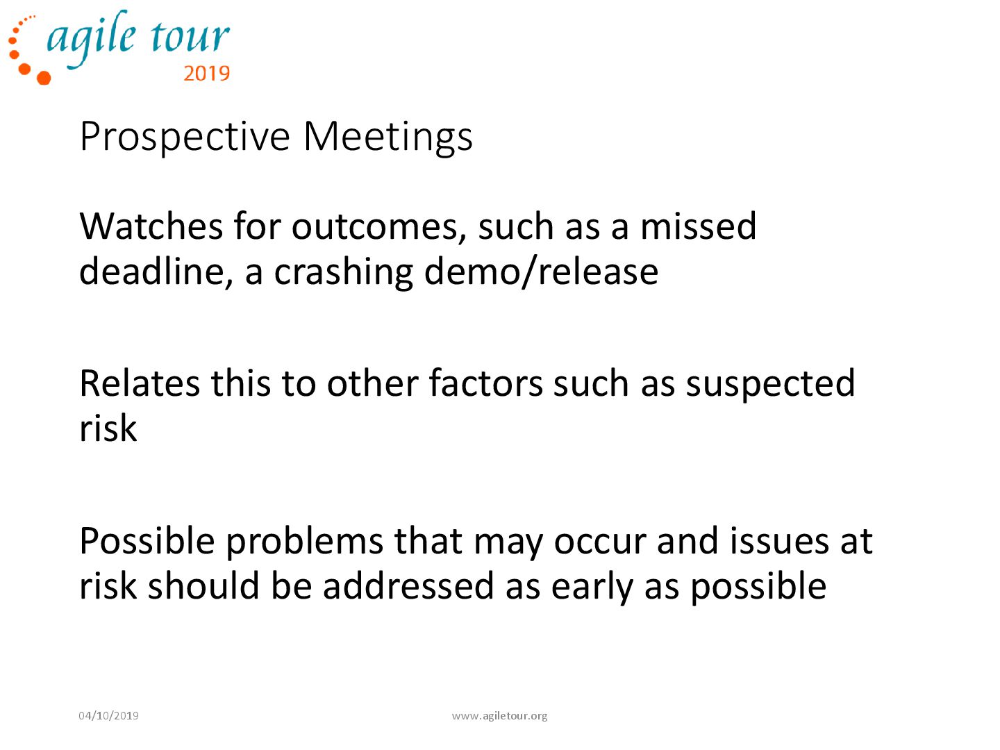 a crashing demo/release Relates this to other factors such as suspected risk Possible problems that may occur and issues at risk should be addressed as early as possible 04/10/2019 www.agiletour.org