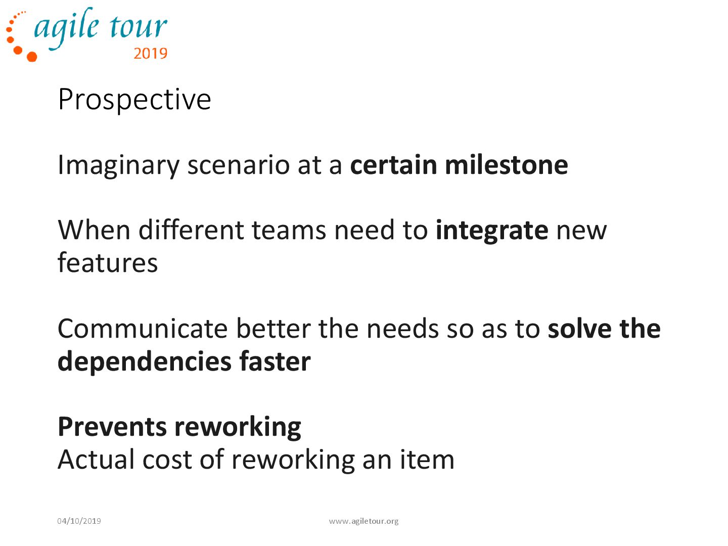 need to integrate new features Communicate better the needs so as to solve the dependencies faster Prevents reworking Actual cost of reworking an item 04/10/2019 www.agiletour.org