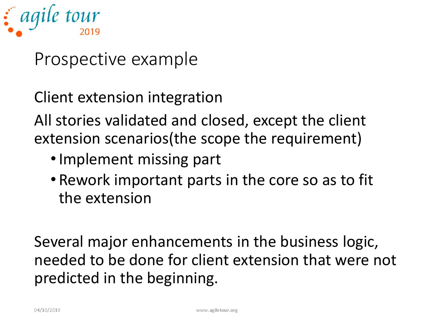 except the client extension scenarios(the scope the requirement) •Implement missing part •Rework important parts in the core so as to fit the extension Several major enhancements in the business logic, needed to be done for client extension that were not predicted in the beginning. 04/10/2019 www.agiletour.org