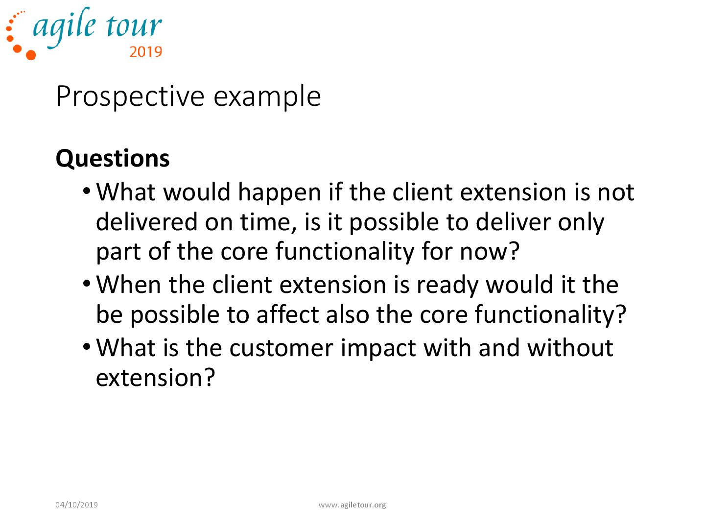 is not delivered on time, is it possible to deliver only part of the core functionality for now? •When the client extension is ready would it the be possible to affect also the core functionality? •What is the customer impact with and without extension? 04/10/2019 www.agiletour.org
