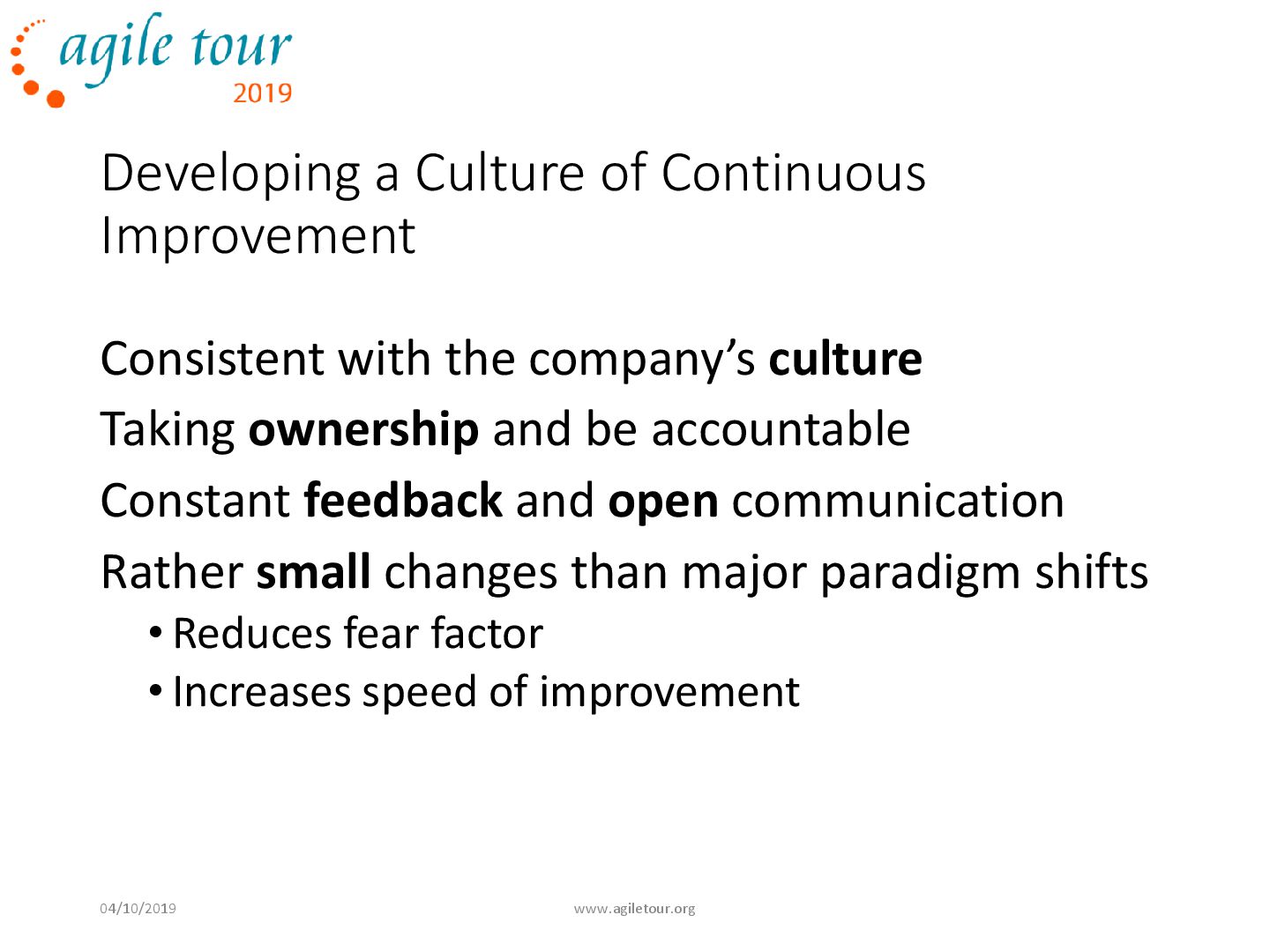 culture Taking ownership and be accountable Constant feedback and open communication Rather small changes than major paradigm shifts • Reduces fear factor • Increases speed of improvement 04/10/2019 www.agiletour.org