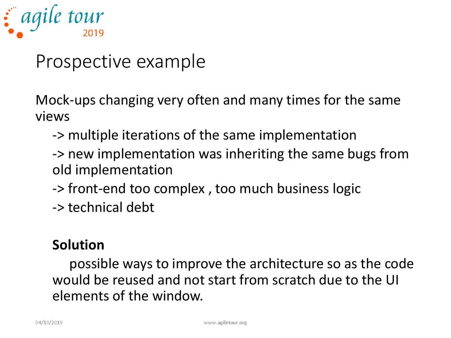 the same views -> multiple iterations of the same implementation -> new implementation was inheriting the same bugs from old implementation -> front-end too complex , too much business logic -> technical debt Solution possible ways to improve the architecture so as the code would be reused and not start from scratch due to the UI elements of the window. 04/10/2019 www.agiletour.org