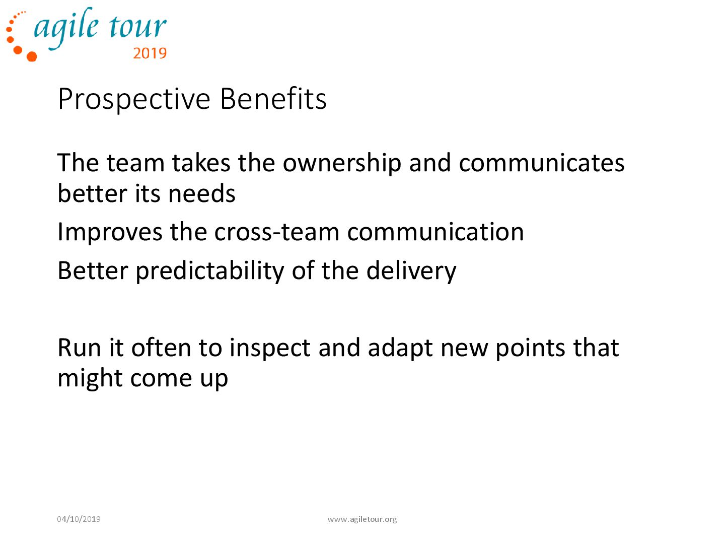 its needs Improves the cross-team communication Better predictability of the delivery Run it often to inspect and adapt new points that might come up 04/10/2019 www.agiletour.org