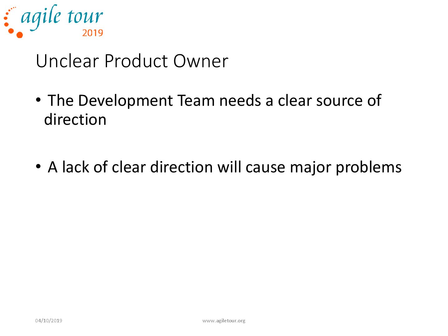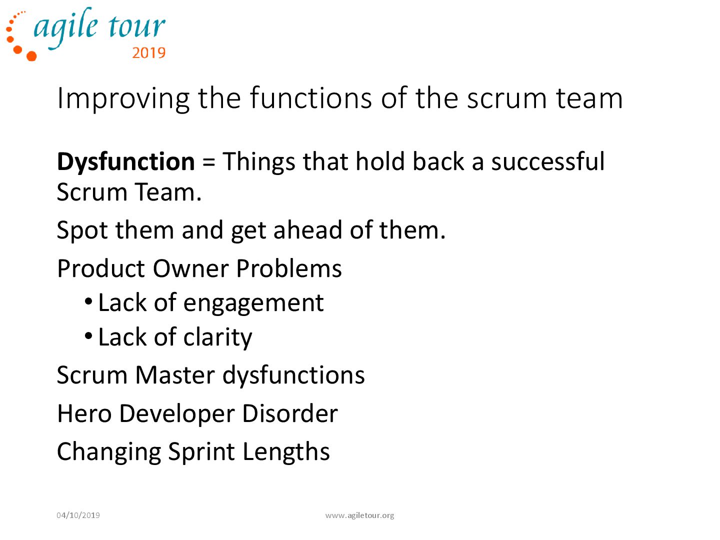 that hold back a successful Scrum Team. Spot them and get ahead of them. Product Owner Problems •Lack of engagement •Lack of clarity Scrum Master dysfunctions Hero Developer Disorder Changing Sprint Lengths 04/10/2019 www.agiletour.org
