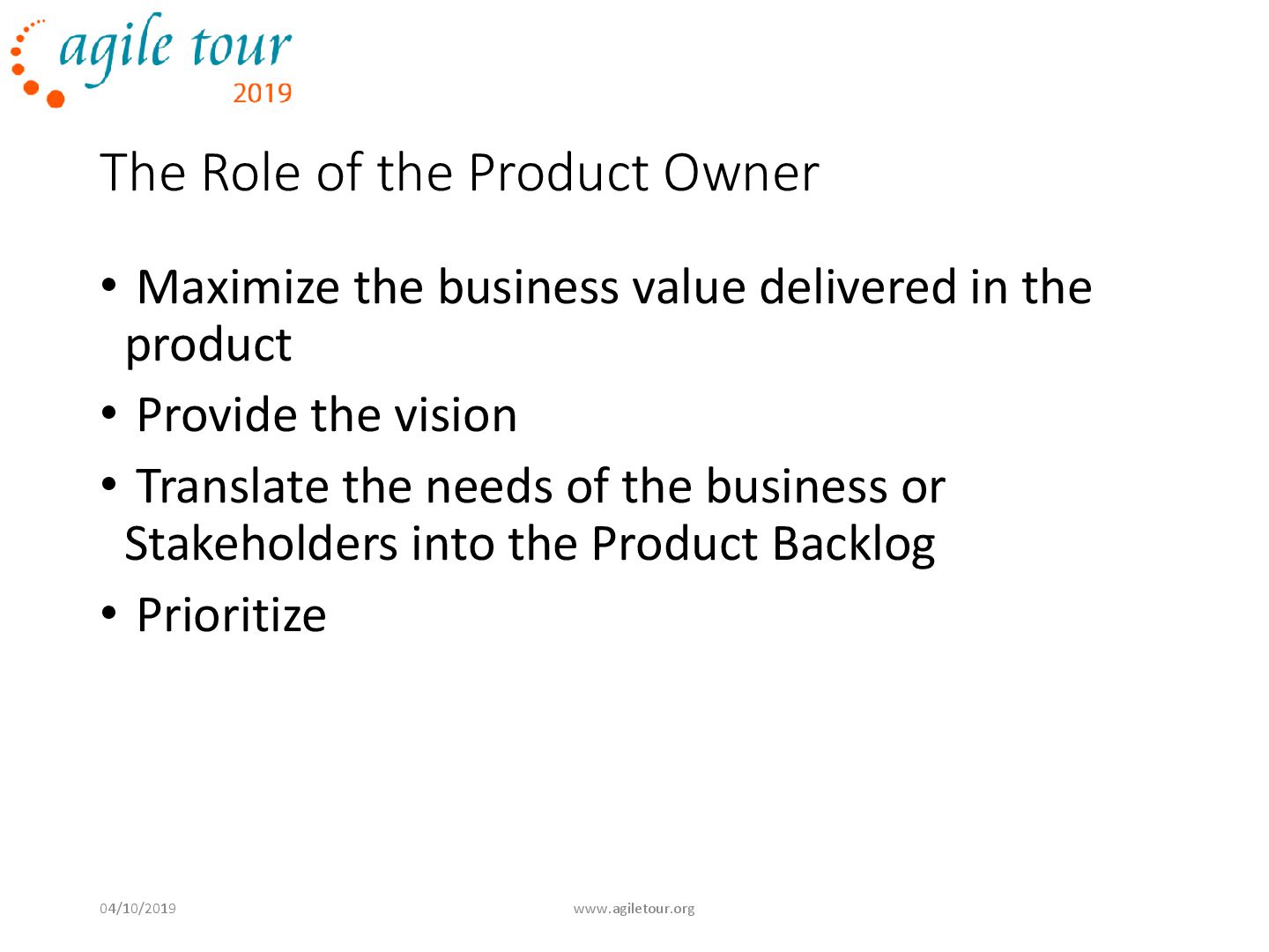 value delivered in the product • Provide the vision • Translate the needs of the business or Stakeholders into the Product Backlog • Prioritize 04/10/2019 www.agiletour.org