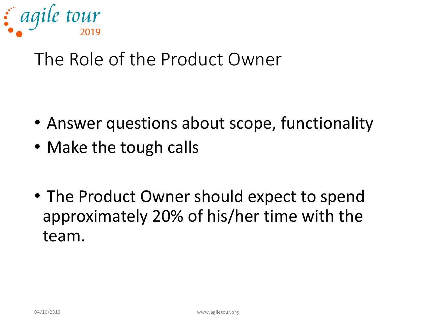 scope, functionality • Make the tough calls • The Product Owner should expect to spend approximately 20% of his/her time with the team. 04/10/2019 www.agiletour.org
