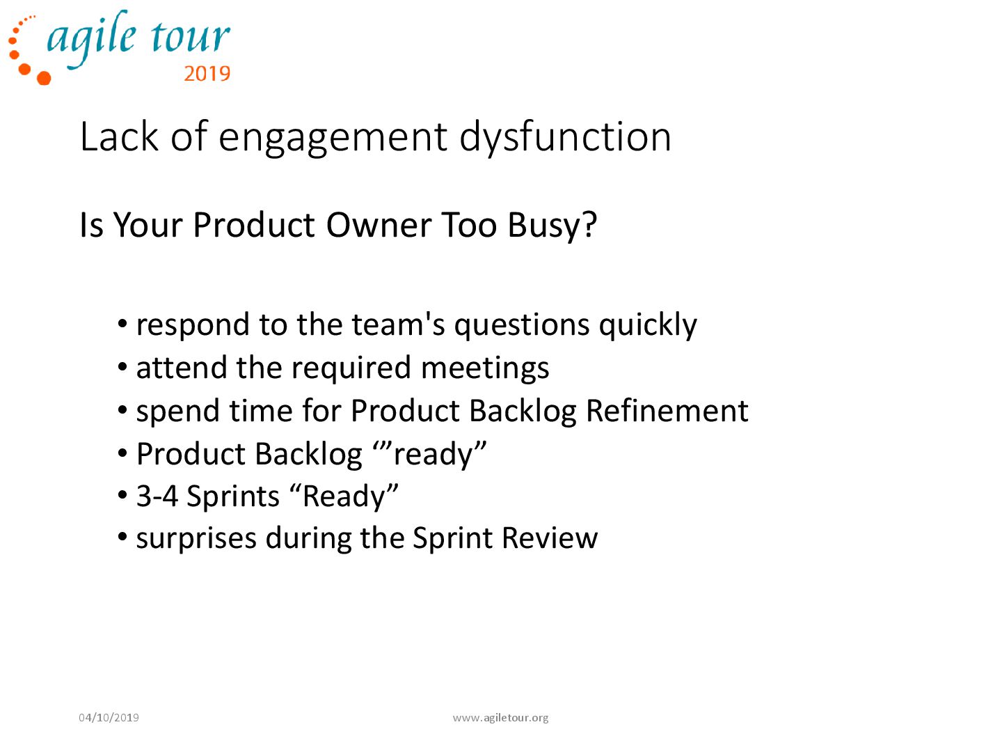 • respond to the team's questions quickly • attend the required meetings • spend time for Product Backlog Refinement • Product Backlog ‘”ready” • 3-4 Sprints “Ready” • surprises during the Sprint Review 04/10/2019 www.agiletour.org