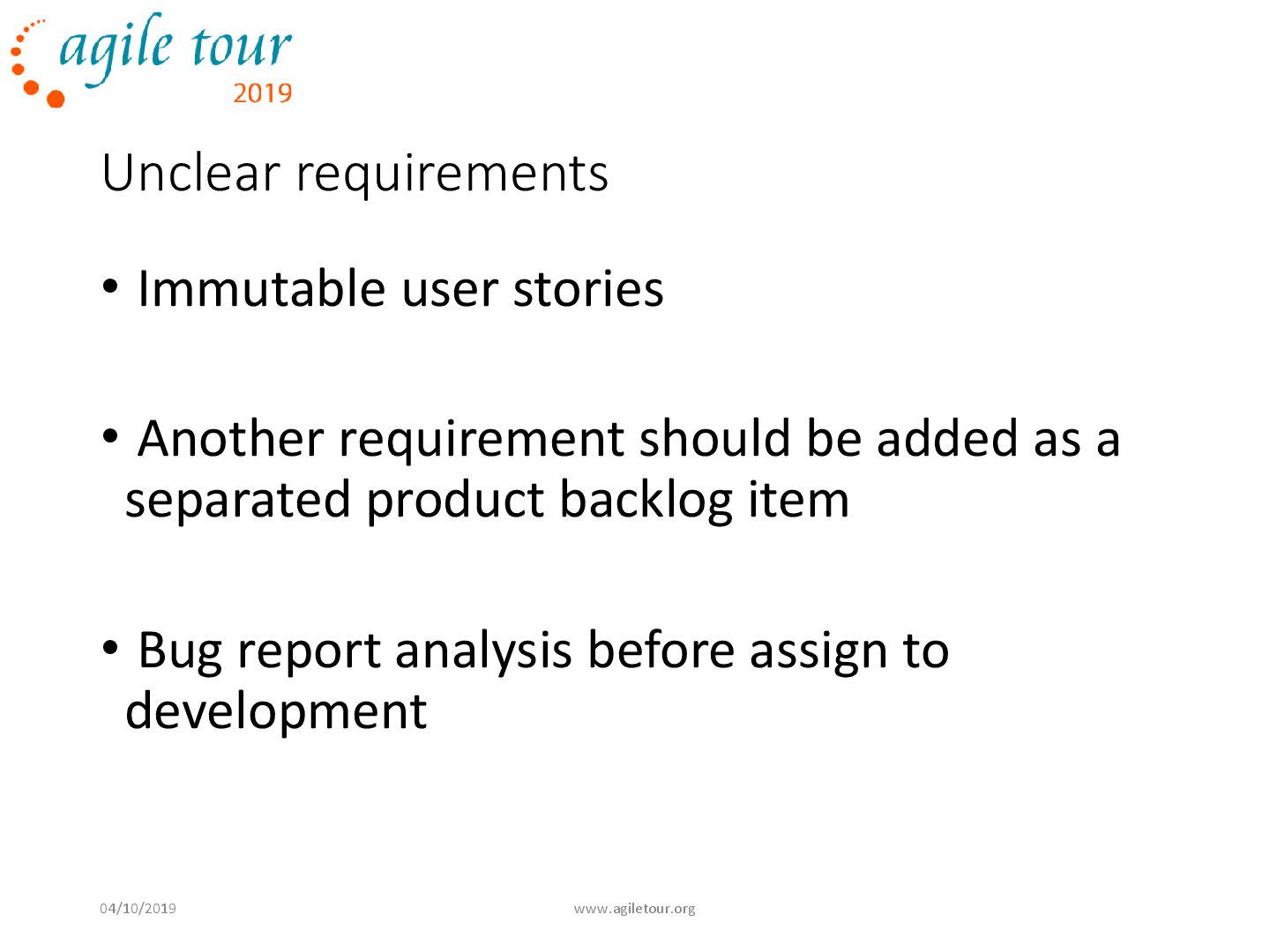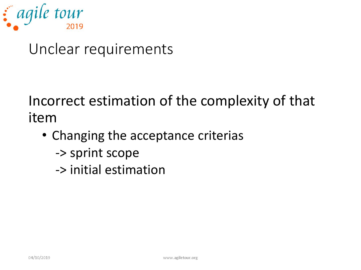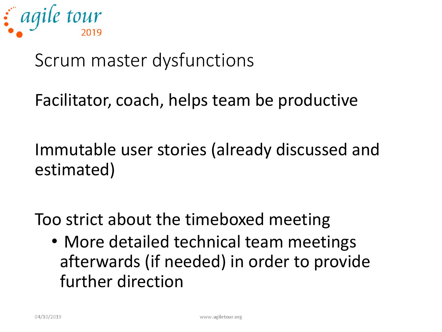 user stories (already discussed and estimated) Too strict about the timeboxed meeting • More detailed technical team meetings afterwards (if needed) in order to provide further direction 04/10/2019 www.agiletour.org