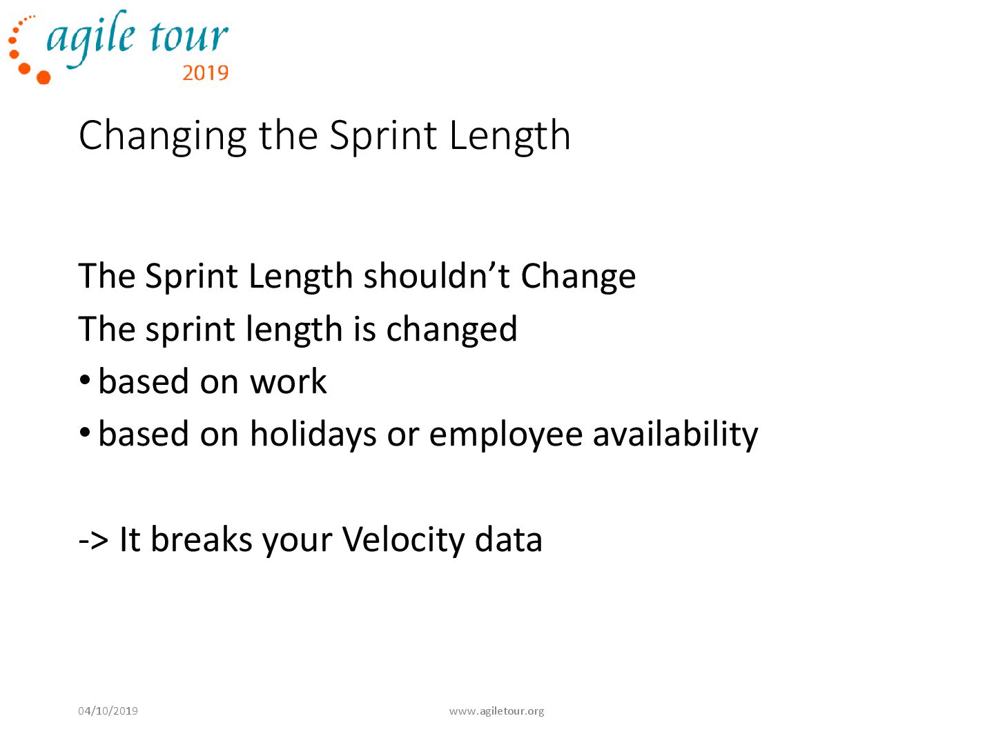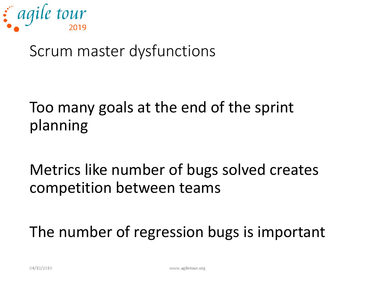 the sprint planning Metrics like number of bugs solved creates competition between teams The number of regression bugs is important 04/10/2019 www.agiletour.org