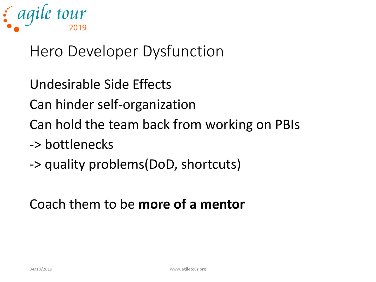 hold the team back from working on PBIs -> bottlenecks -> quality problems(DoD, shortcuts) Coach them to be more of a mentor 04/10/2019 www.agiletour.org