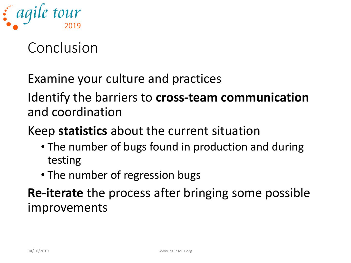 cross-team communication and coordination Keep statistics about the current situation • The number of bugs found in production and during testing • The number of regression bugs Re-iterate the process after bringing some possible improvements 04/10/2019 www.agiletour.org