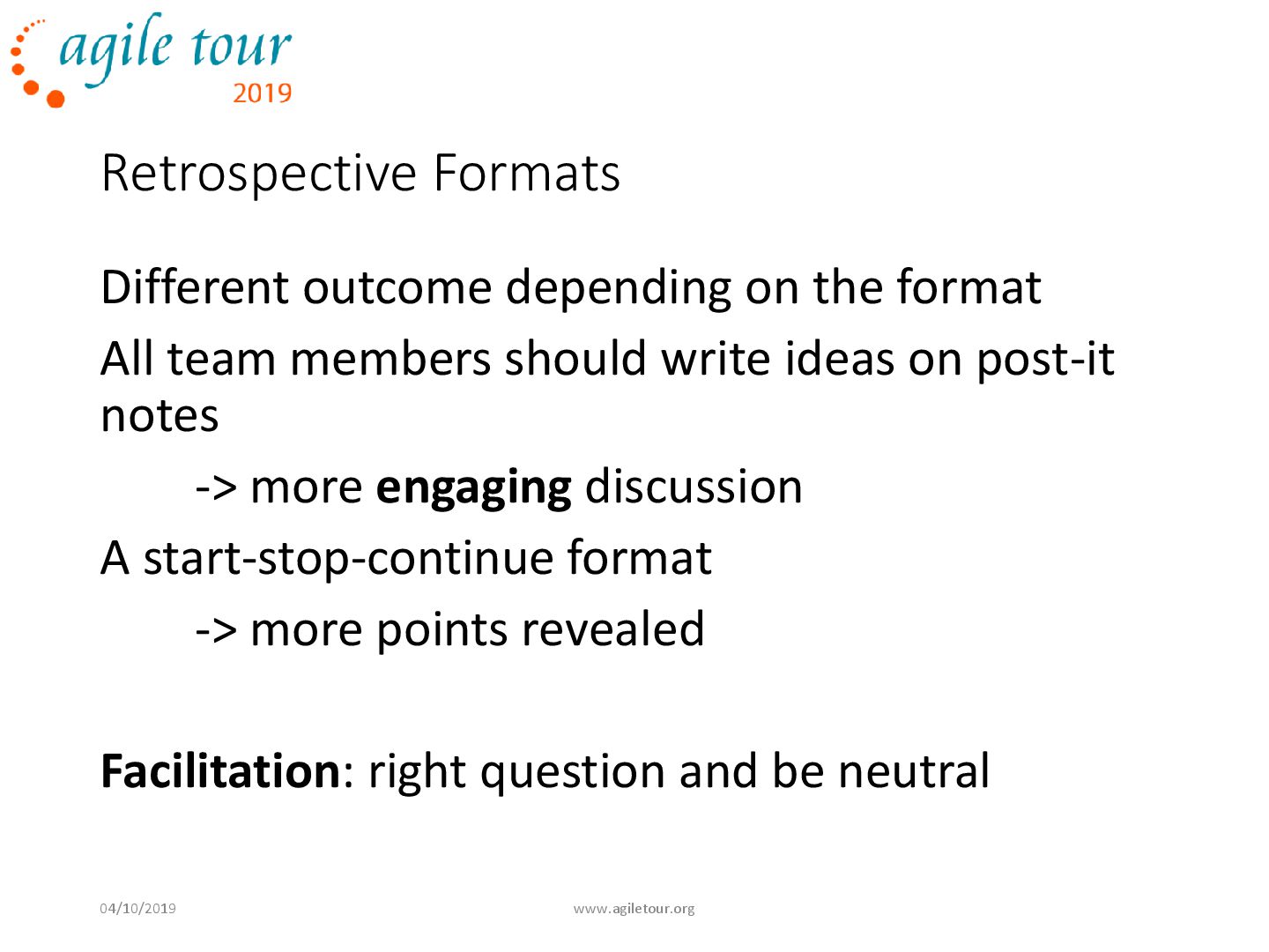 members should write ideas on post-it notes -> more engaging discussion A start-stop-continue format -> more points revealed Facilitation: right question and be neutral 04/10/2019 www.agiletour.org