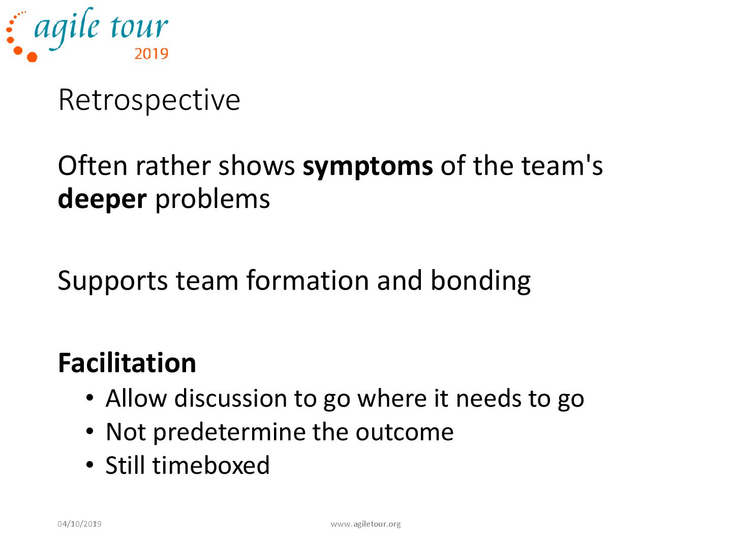 Supports team formation and bonding Facilitation • Allow discussion to go where it needs to go • Not predetermine the outcome • Still timeboxed 04/10/2019 www.agiletour.org