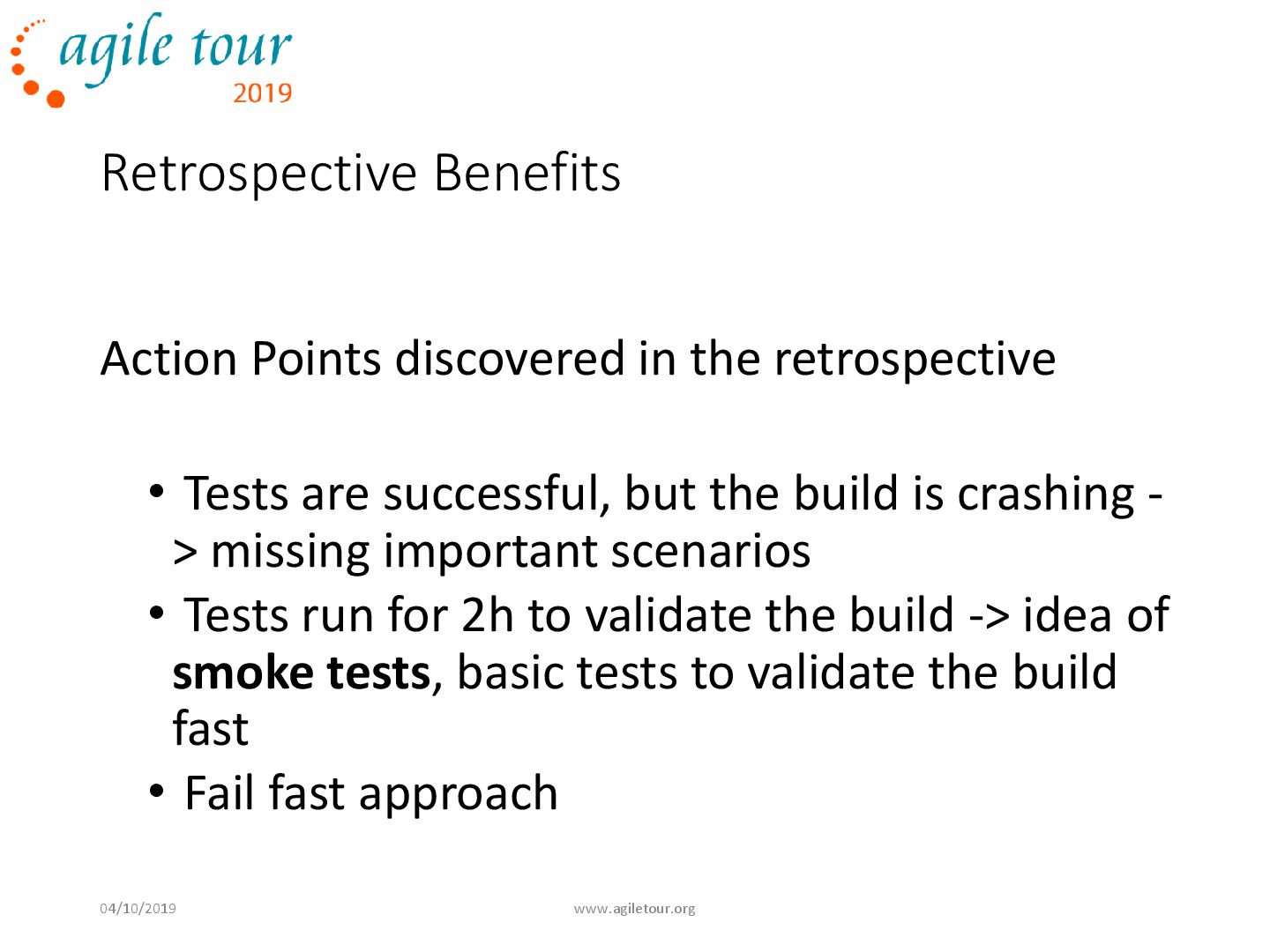 are successful, but the build is crashing - > missing important scenarios • Tests run for 2h to validate the build -> idea of smoke tests, basic tests to validate the build fast • Fail fast approach 04/10/2019 www.agiletour.org