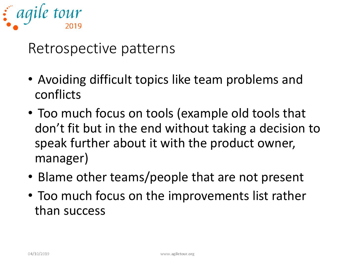 conflicts • Too much focus on tools (example old tools that don’t fit but in the end without taking a decision to speak further about it with the product owner, manager) • Blame other teams/people that are not present • Too much focus on the improvements list rather than success 04/10/2019 www.agiletour.org