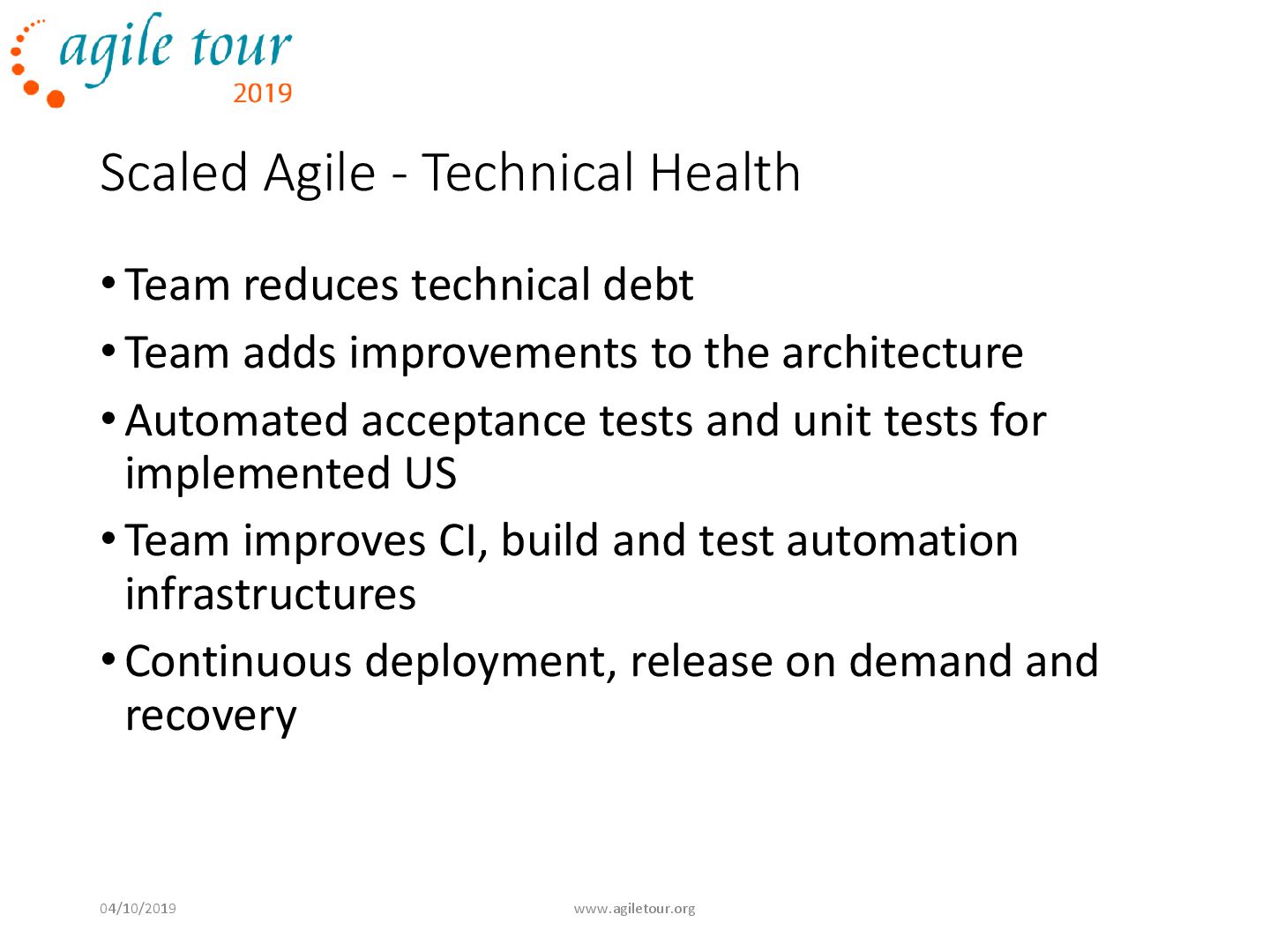 debt •Team adds improvements to the architecture •Automated acceptance tests and unit tests for implemented US •Team improves CI, build and test automation infrastructures •Continuous deployment, release on demand and recovery