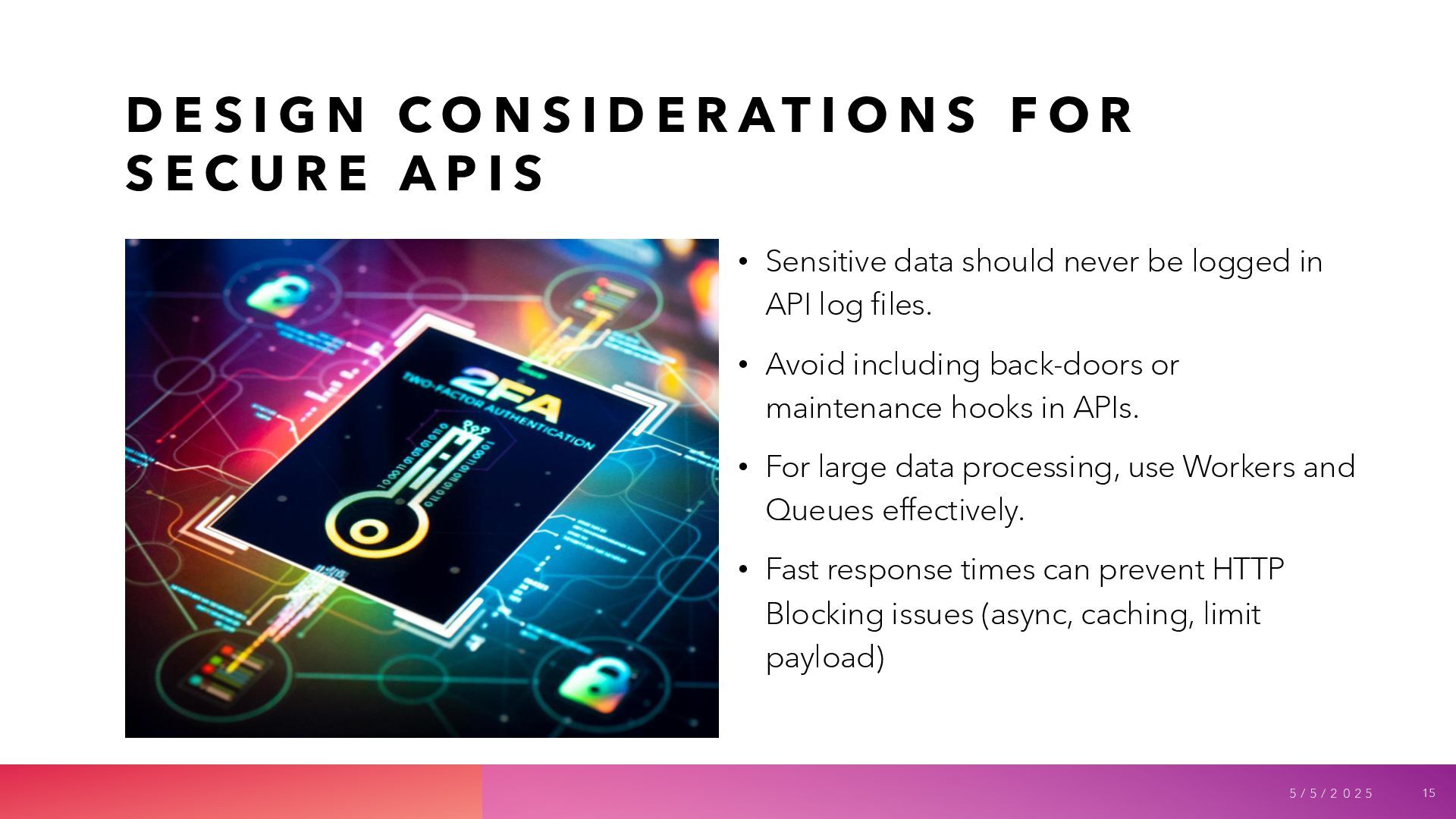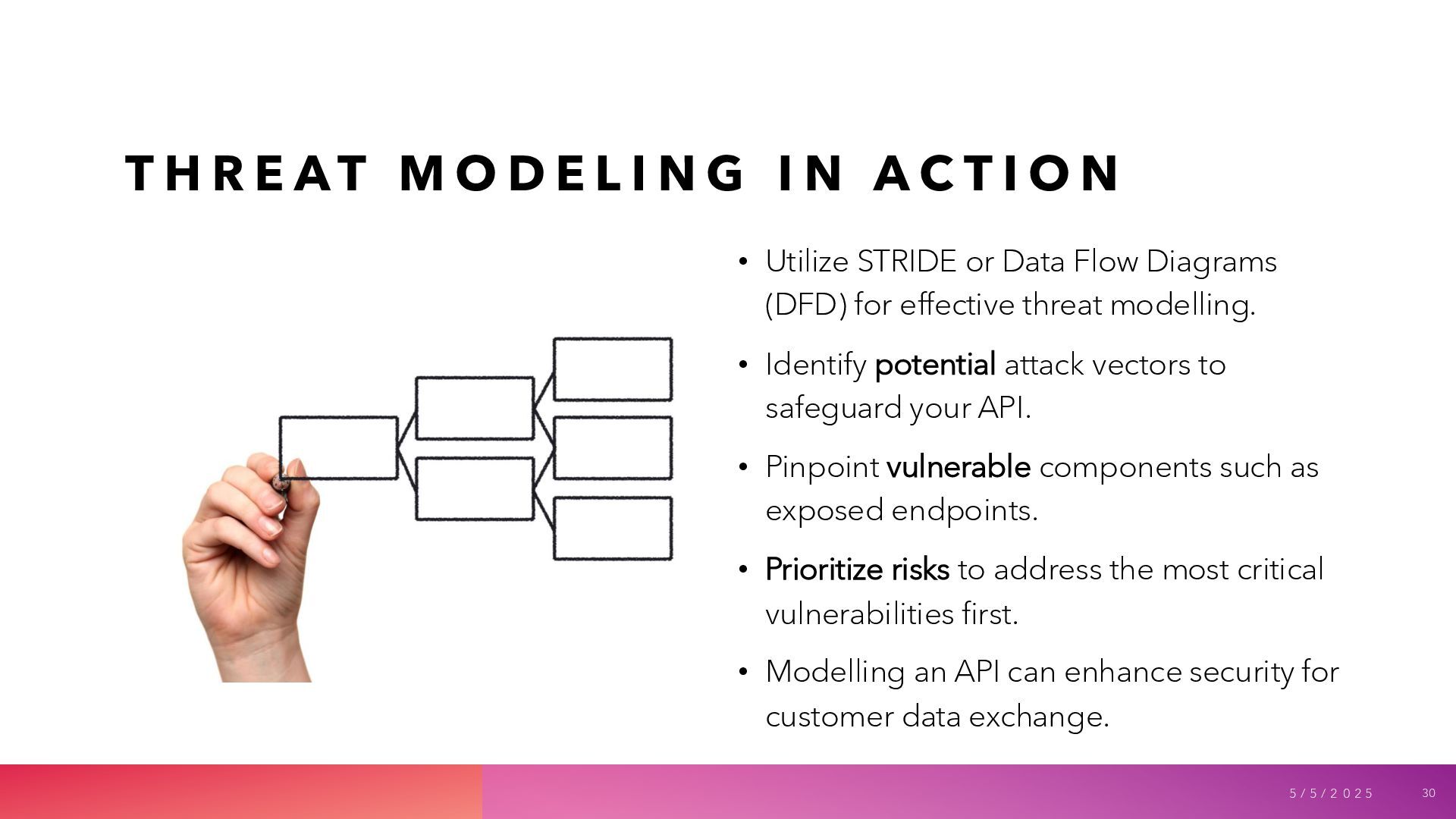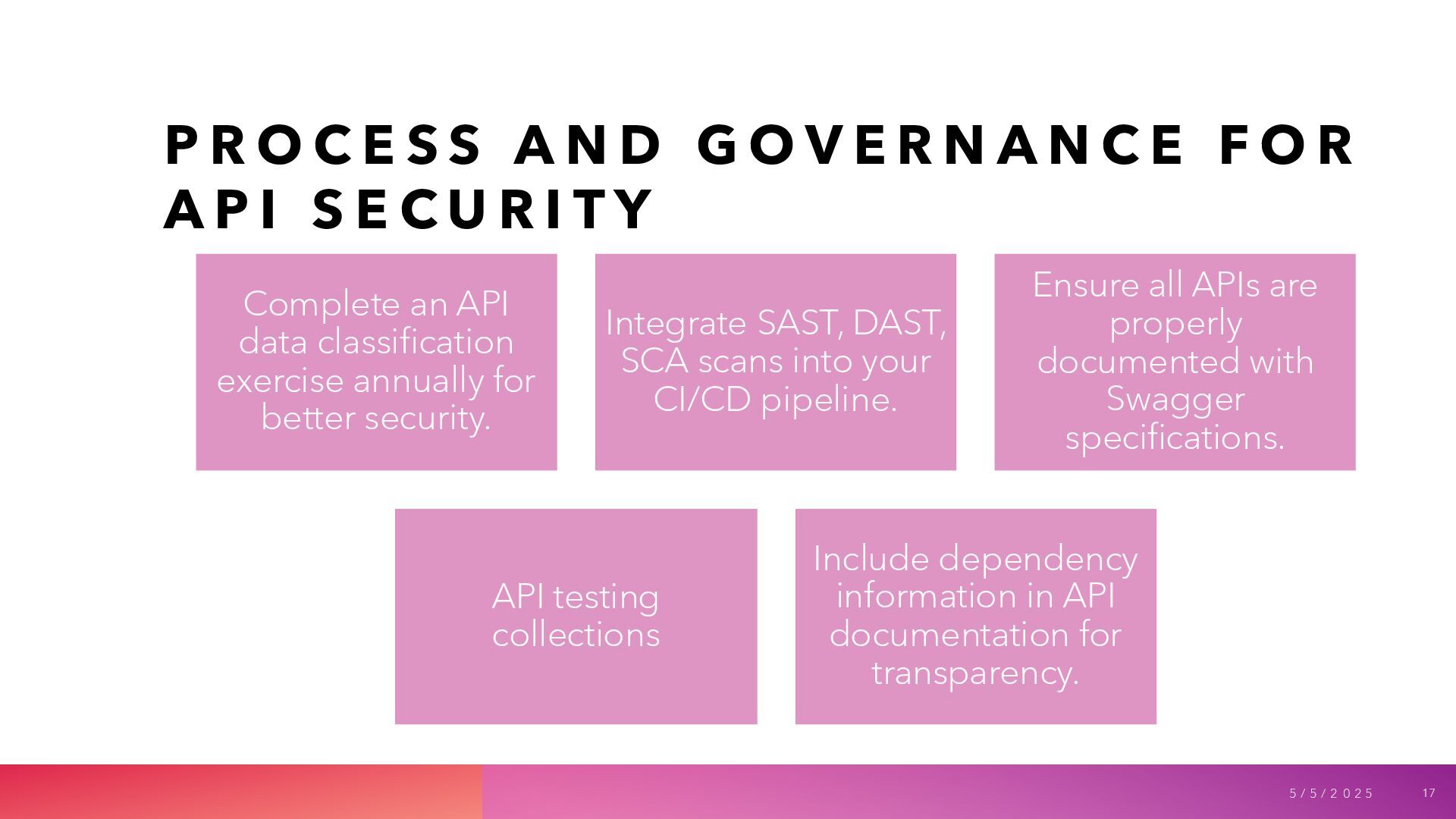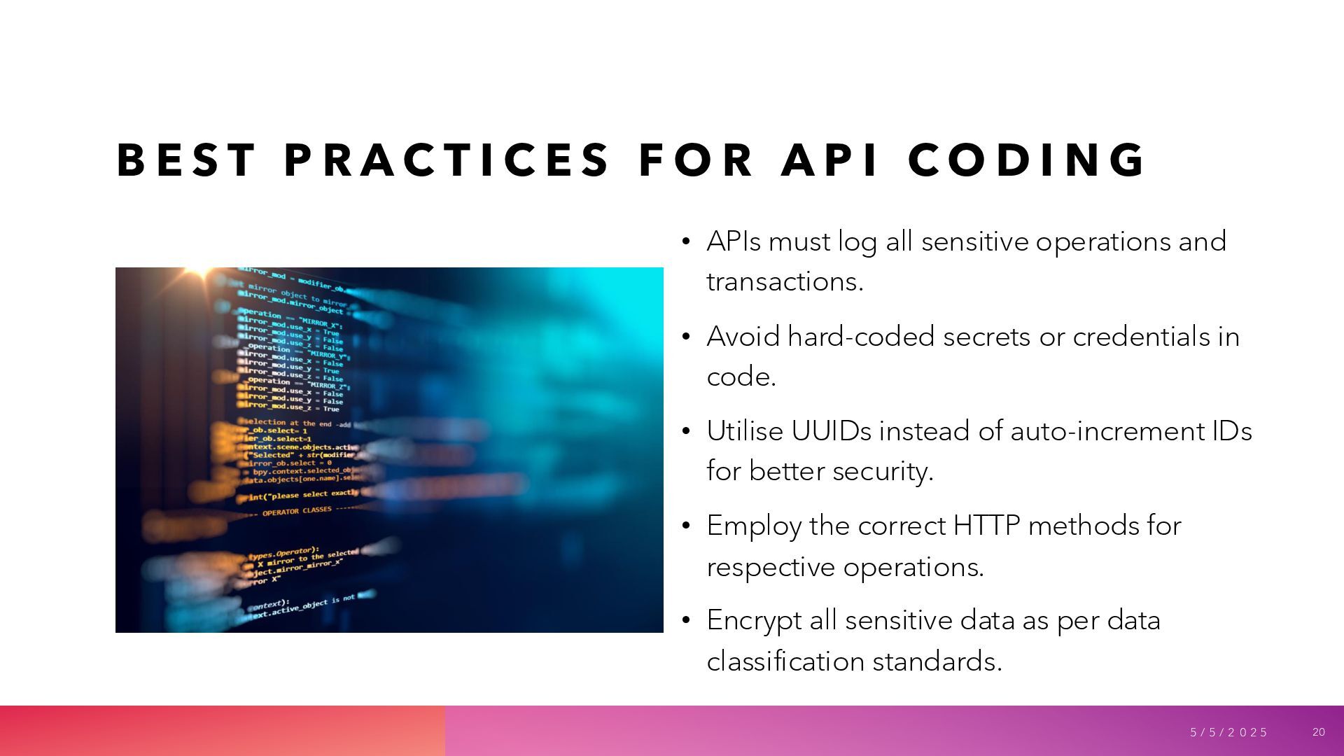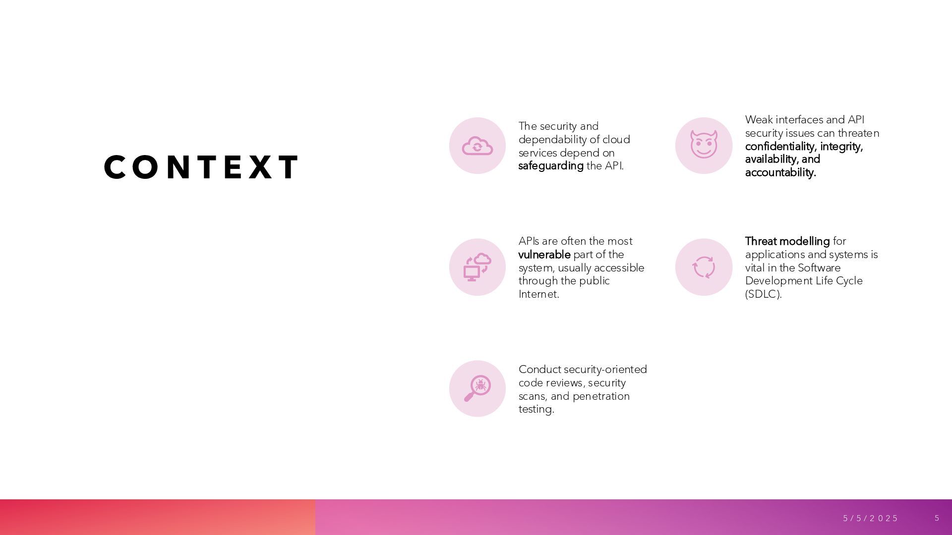 / 2 0 2 5 5 The security and dependability of cloud services depend on safeguarding the API. Weak interfaces and API security issues can threaten confidentiality, integrity, availability, and accountability. APIs are often the most vulnerable part of the system, usually accessible through the public Internet. Threat modelling for applications and systems is vital in the Software Development Life Cycle (SDLC). Conduct security-oriented code reviews, security scans, and penetration testing.