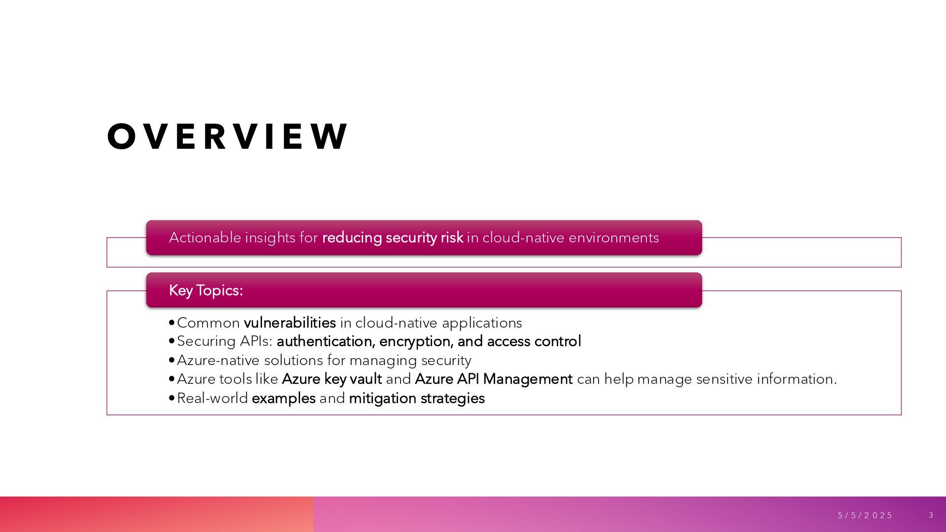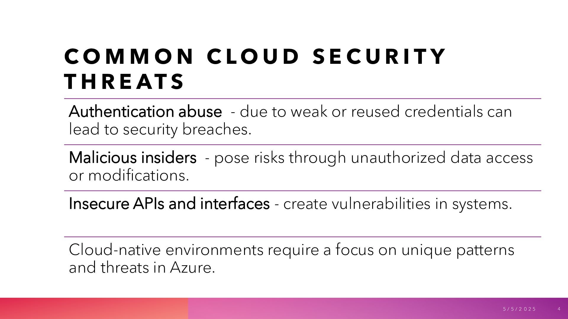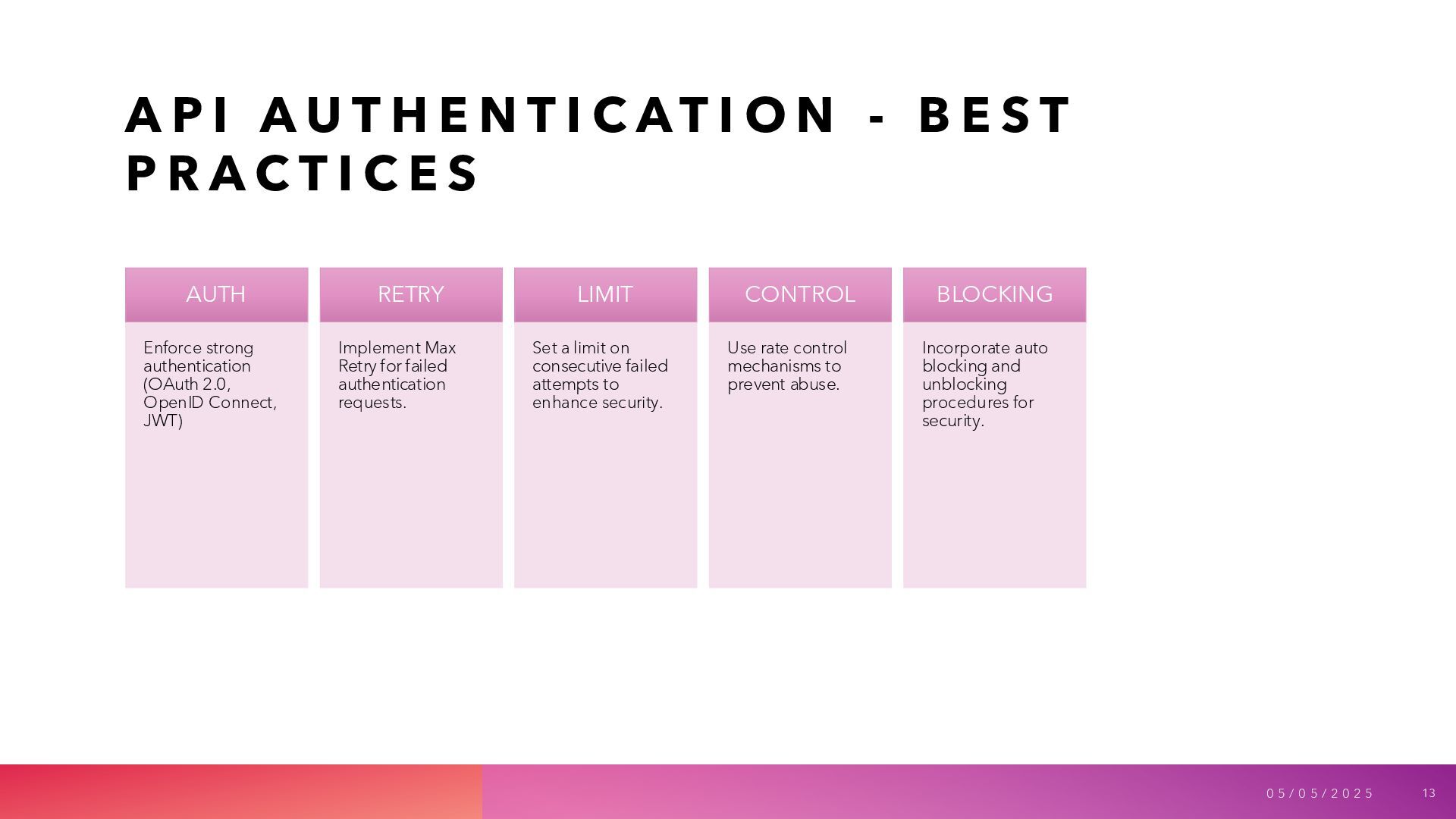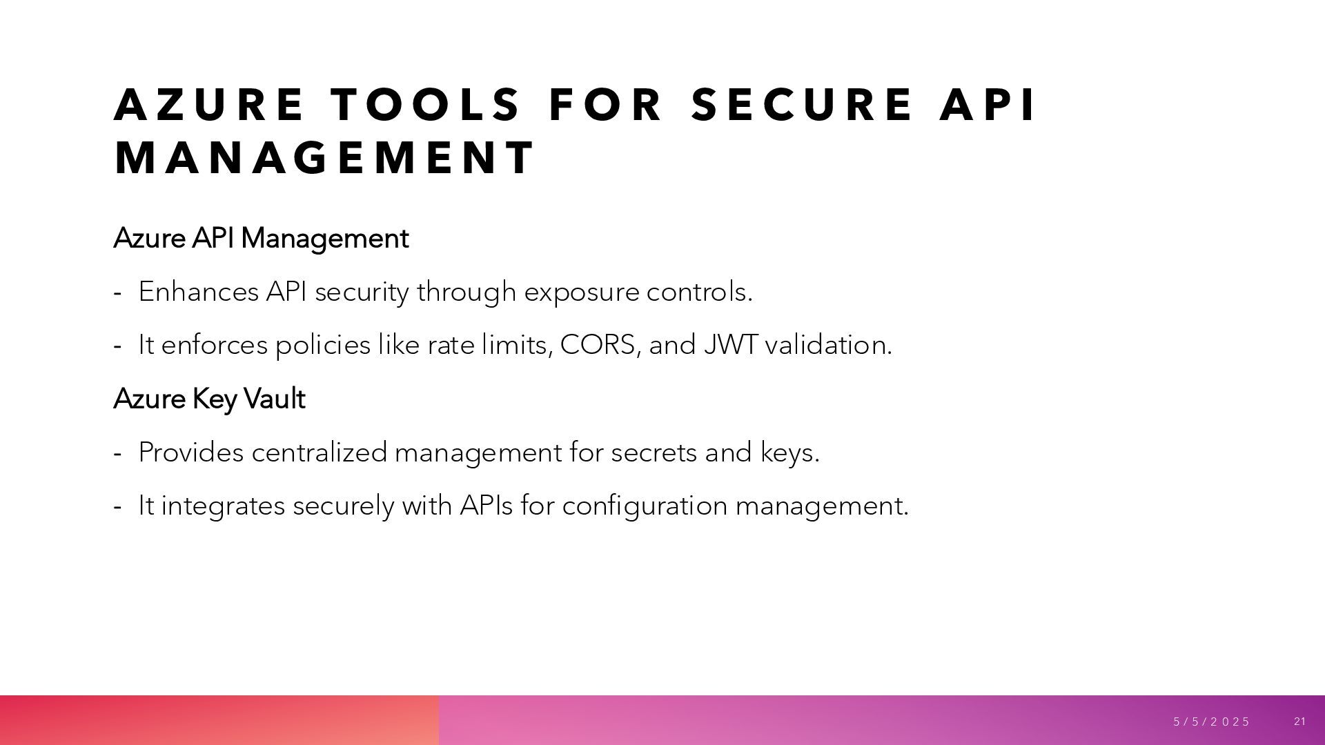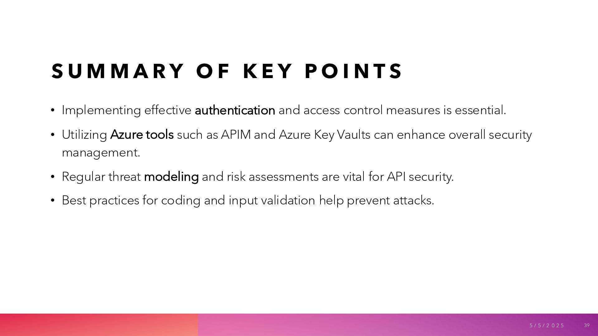 / 2 0 2 5 5 The security and dependability of cloud services depend on safeguarding the API. Weak interfaces and API security issues can threaten confidentiality, integrity, availability, and accountability. APIs are often the most vulnerable part of the system, usually accessible through the public Internet. Threat modelling for applications and systems is vital in the Software Development Life Cycle (SDLC). Conduct security-oriented code reviews, security scans, and penetration testing.
