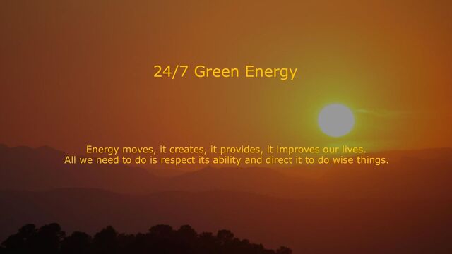 Welcome to 24/7 Green Energy. Energy moves, it creates, it provides, it improves our lives. All we need to do is respect its ability and direct it to do wise things.